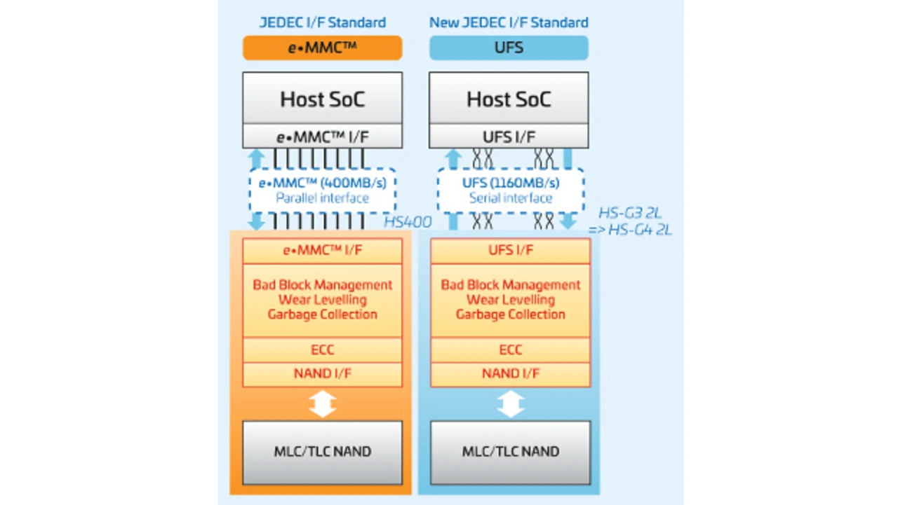 Nachdem der eMMC-Standard am Ende seines Lebenszyklus angelangt war, entwickelte die gleiche Arbeitsgruppe einen neuen Standard, der die Einschränkungen von eMMC überwindet – sowohl jetzt als auch in Zukunft. Dieser Standard heißt UFS (Universal Flash Storage) und ist auf die Anforderungen von Flash als Speichermedium zugeschnitten. Er bietet gleichzeitig die Vorteile anderer gängiger Speicherschnittstellen und Protokolle wie die vorangegangenen Standards bei MIPI (eMMC) und SCSI zuvor.