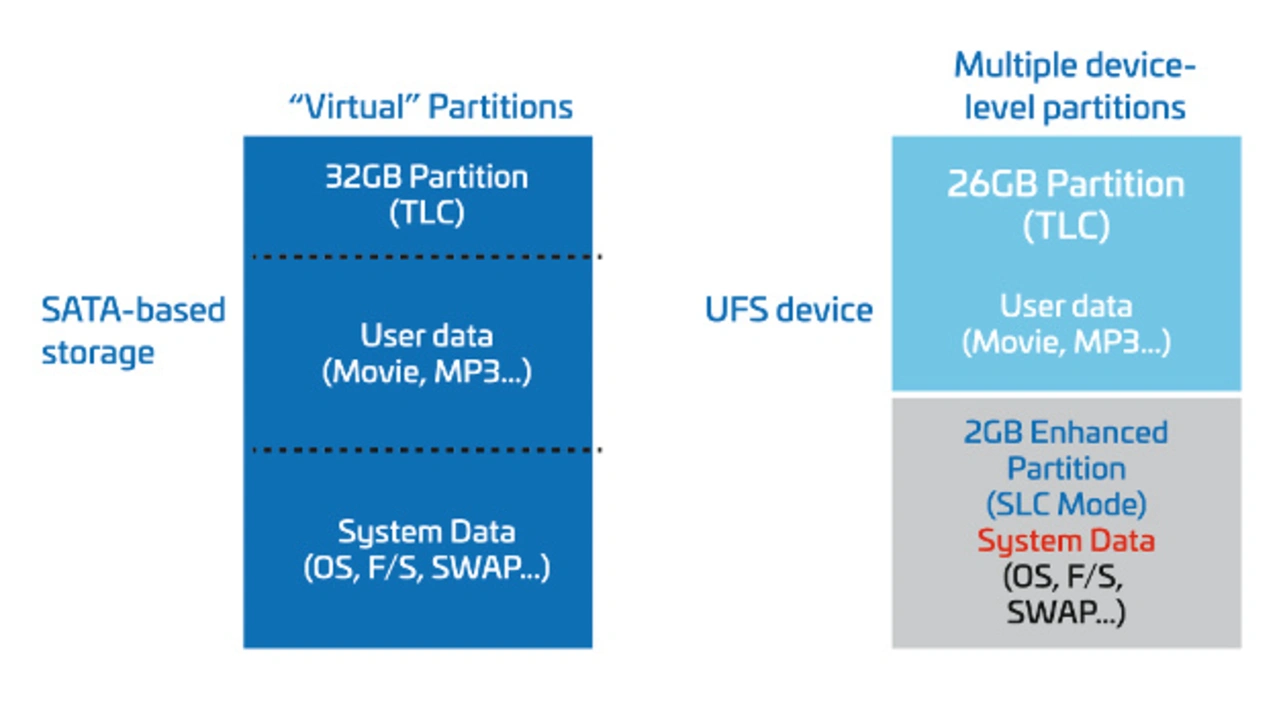 Der MIPI-M-PHY-Standard definiert unterschiedliche „Gear“-Geschwindigkeiten, wobei Gear 1 an die 1,46 GBit/s und Gear 4 an die 11,6 GBit/s unterstützt. Die Schnittstelle unterstützt auch asynchrone Datenübertragung und Energiesparmodi mit niedrigem Stromverbrauch. Die Partitionierung ist ein weiterer Bereich für Verbesserungen, da UFS das Speichermedium in mehrere Partitionen auf Device-Ebene aufteilt. Die Partitionen lassen sich auch so konfigurieren, dass sie die maximale Speicherkapazität des Flash (TLC-Modus) oder maximale Endurance (pSLC-Modus) nutzen.