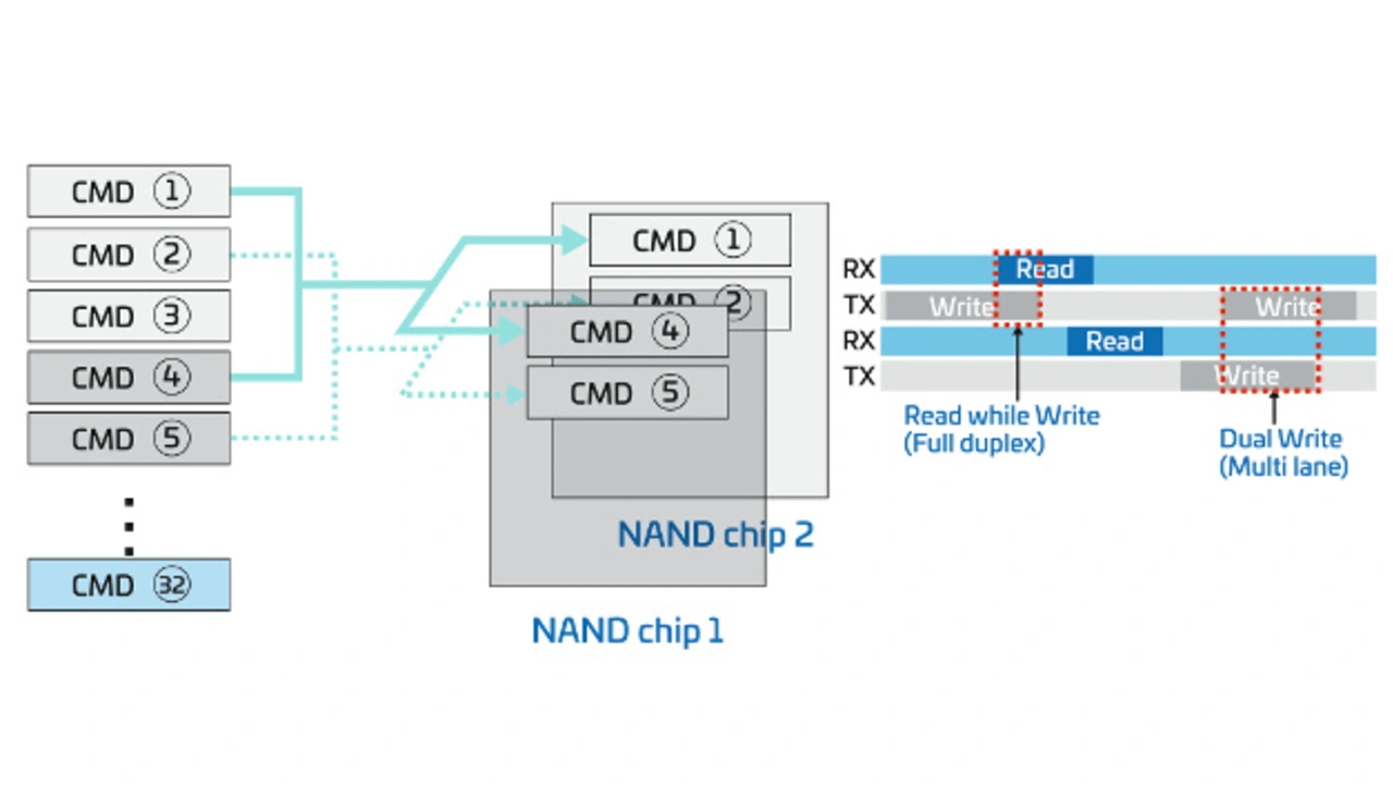 Speicherzugriffe in Anwendungen lassen sich grob in sequenzielle (wie die Wiedergabe von Videos oder Musik) und zufällige (wie Web-Browsing, Umschalten zwischen Apps, Booten und Lesen von E-Mails) aufteilen. Multitasking-Betriebssysteme benötigen daher gleichzeitige Lese- und Schreibzugriffe, die sowohl für sequenzielle als auch für zufällige Datenzugriffe effizient sind. UFS unterstützt dies, indem es Vollduplex- und Dual-Multipage-Programmierung über mehrere Leitungen anbietet.