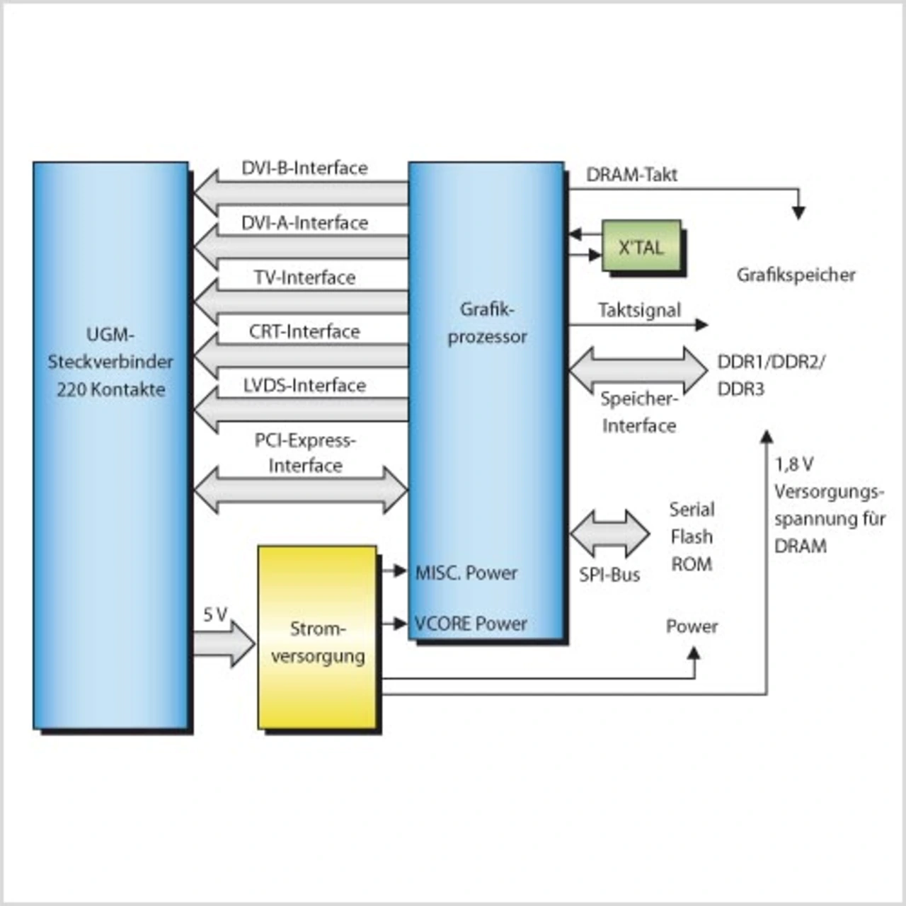 Das Grafikprozessor-Modul ist stets komplett und mit allen erforderlichen Treibern ausgestattet. Systemhersteller und OEM können also sicher sein, ein ausgereiftes, stabiles System zu erwerben, das zuverlässig unter den unterstützten Betriebssystemen arbeitet. Das vom Consumerbereich bekannte Problem immer wieder neuer, z.T. inkompatibler Grafikkarten- Treiber, die die Umsetzung angekündigter Features verhindern oder das Gesamtsystem instabil werden lassen, und ständige, aufwendige Treiber- und Software-Updates werden vermieden. Auch wird bei diesem Design gänzlich auf Kabel verzichtet. Damit unterscheidet sich UGM auch von aktuellen Standard-Grafikkarten, bei denen heute Schnittstellen bereits über Kabelpeitschen ausgeführt werden, weil die schmale Frontplatte der Erweiterungskarten nicht hinreichend Platz für externe Anschlüsse bietet. Bei 5 V Gleichspannungsversorgung sind darüber hinaus gemäß UGM-Spezifikation bis zu 45 W Verlustleistung zulässig. Damit kann UGM selbst absolute High-end-Spiele mit höchsten Frame-Raten und allen Grafik-Optimierungsalgorithmen perfekt unterstützen.