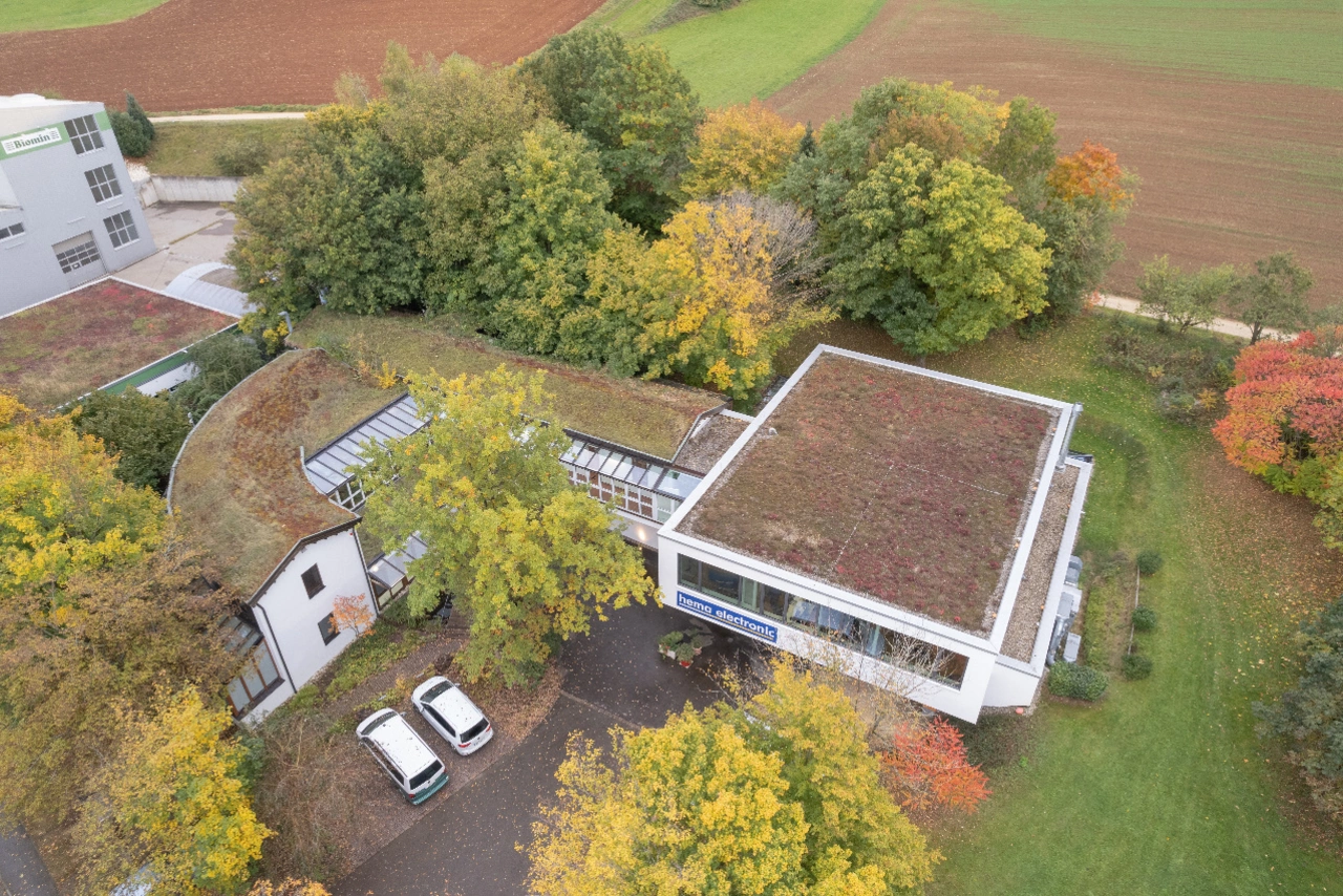 Oliver Helzle: »High-Tech im grünen Pelz« titelte die Schwäbische Post 1986, als sie über unseren damaligen Neubau mit einem Grasdach berichtete. Das Gebäude wurde nach ökologischen Gesichtspunkten geplant und gebaut. Mit Holz und Ziegelsteinen aus der Region, viel Glas für natürliches Licht und optimale Arbeitsbedingungen, selbstklimatisierend und mit minimaler Versiegelung rund um die Anlage. Im Gebäude gibt es einen Wasserlauf und viele Pflanzen. Dieses Selbstverständnis für einen sparsamen Umgang mit Ressourcen, für Umweltschutz und Nachhaltigkeit wirkt bis heute. Ich würde sagen: hema ist ziemlich grün.
