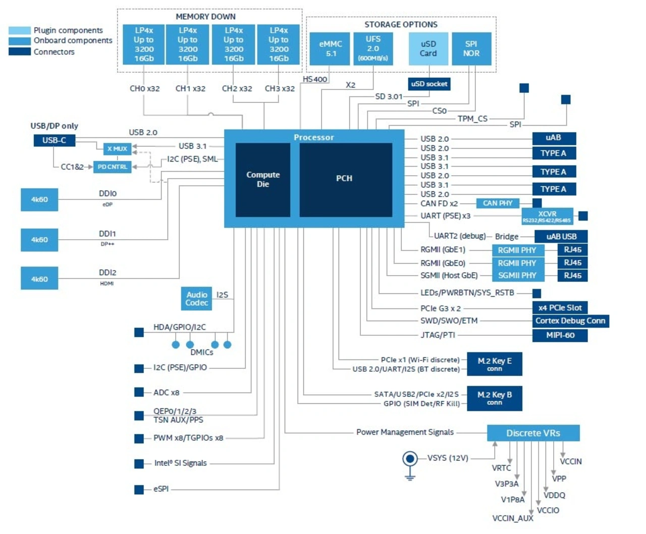 Zur umfangreichen Software-Unterstützung gehört eine Programmable Services Engine Firmware, die als Grundlage das Open-Source-Echtzeitbetriebssystem Zephyr nutzt. Auf dieser Basis können Entwickler die Funktionsweise der PSE anpassen. Für die Grafik-Hardware liefert Intel ein Media-SDK, das das Open-Source-Framework GStreamer für die Videoverarbeitung verwendet. Weiterhin gibt es eine Intel-Distribution des OpenVINO-Toolkits, mit dem die GPU zur Beschleunigung neuronaler Netzwerke eingesetzt werden kann. Die Echtzeit- und Kommunikationsfunktionen werden durch ein Software-Toolkit für Time Coordinated Comuting und Time Sensitive Networking unterstützt. Als Betriebssysteme können Anwender zwischen Windows 10, Yocto (Intel-Implementierung), Wind River Linux und Android 10 wählen.