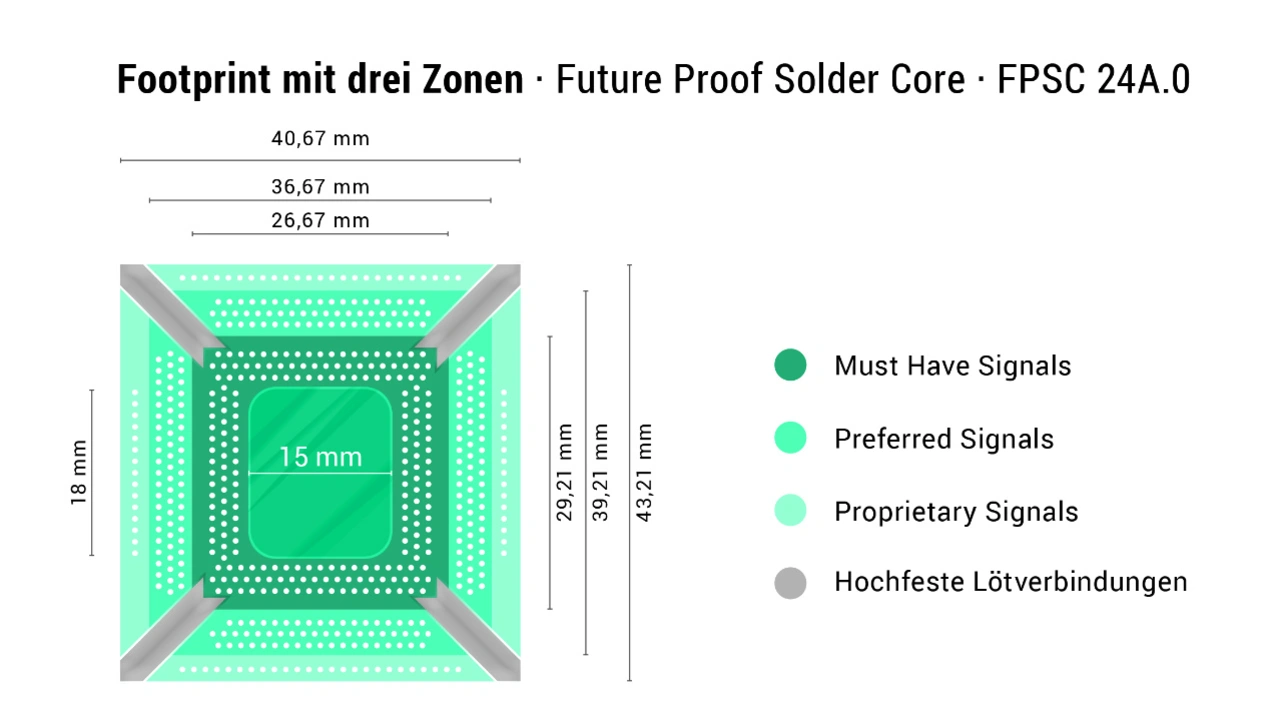 Dennoch wurde das Design der FPSC-Module im Hinblick auf optimale Verarbeitbarkeit und hochfeste Lötverbindungen optimiert: Hierzu verfügen die Module an den Ecken über Flächen für die Lötverbindung, die durch ihre Geometrie eine maximale Robustheit und Kraftverteilung gewährleisten. Die Aufteilung in konzentrische Zonen ermöglicht bei Bedarf auch größere Module für künftige Prozessoren, die dennoch dieselben Must-have-Signale bieten. Prüfungen auf Schwingungen und Schock gemäß Normenreihe EN 60068-2 bestätigen die hohe Festigkeit der Lötverbindung, die andere Lötmodul-Standards übertrifft. Die Pins der SoMs werden mittels Fused Tin Grid Array (FTGA)-Technik verlötet. Das Verfahren eignet sich ideal für die Verbindung zweier PCBs, auch bei Abweichungen in der Koplanarität der Platinen. Mit beidseitigen Lötzinn-Reservoirs vereinfacht Phytec die Verarbeitbarkeit und minimiert das Risiko fehlerhafter Lötstellen.