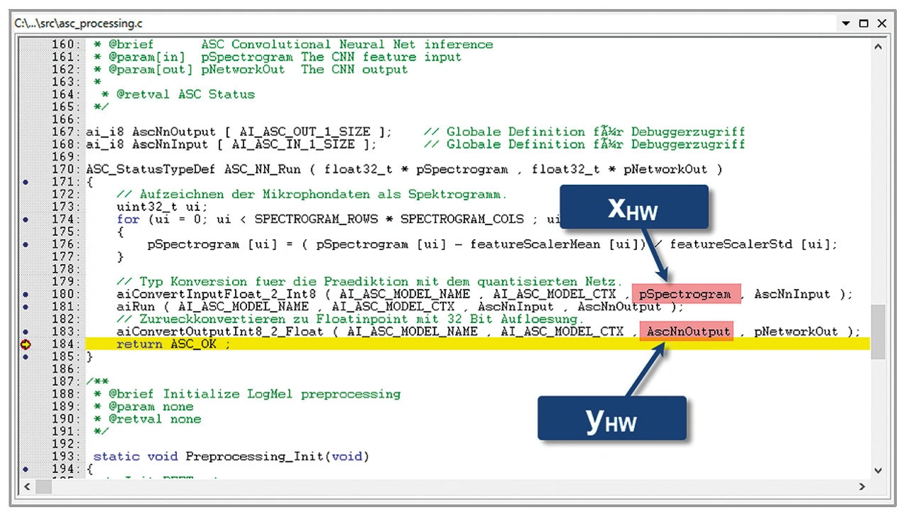 An dieser Codestelle lassen sich sowohl die Eingangsmatrix xHW als auch die dazu passende Ausgangsmatrix yHWin der Funktion »ASC_NN_RUN« über die Automatisierungsschnittstelle der UDE auslesen. Anschließend ist die Diagnoseschleife mit dem Analysesystem und den Referenzmodellen auszuführen.