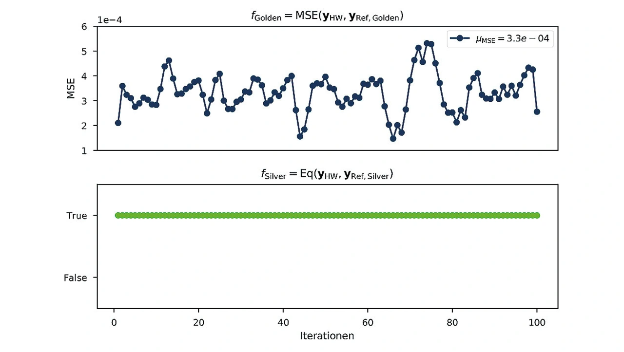 Das Diagramm in Bild 4 zeigt exemplarisch einen Ausschnitt von 100 Durchläufen der Diagnoseschleife. Es ist zu erkennen, dass die Outputmatrizen der Hardwarerealisierung und die des Silver Models stets übereinstimmen. Der gemittelte MSE beträgt µMSE = 3,3 ∙ 10-4 und ist somit in einem Rahmen, der aufgrund der Quantisierung zu erwarten ist.