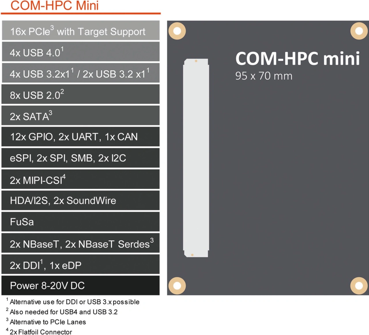 Die Pins sind anders und teils mit mehreren Optionen belegt, um über die 400 Pins möglichst alle absehbaren Konfigurationen umsetzen zu können. Zudem wurde die Spannungsbelegung der Sideband-Signale angepasst, um den Energiebedarf zu reduzieren und vor allem Low-Power-Prozessoren zu unterstützen, die vermehrt mit 1,8 V arbeiten. Hiermit vereinfachen wir sowohl Modul- als auch Carrier-Board-Designs, weil es weniger Pegelwandler braucht, als wenn Entwickler bei der identischen Spezifikation der größeren COM-HPC-Formfaktoren blieben.