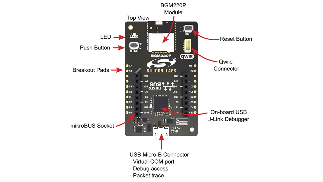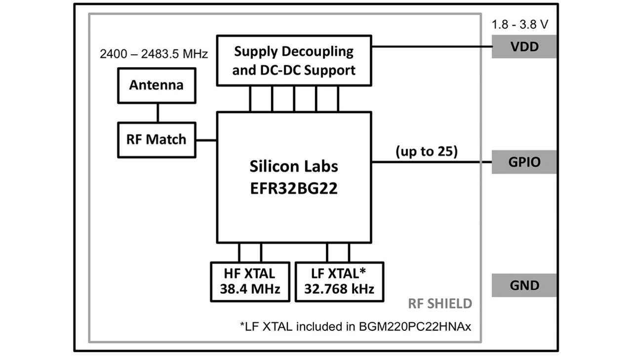 Das SoC Blue-Gecko EFR32BG22 des BGM220P-Moduls läuft auf einem 32-bit-Arm-Cortex-M33-Kern. Außerdem integriert es ein 2,4-GHz-Funkgerät, Sicherheits- und Energiemanagement-Subsysteme sowie mehrere Timer und Schnittstellenoptionen. Es wurde speziell für batteriebetriebene Designs mit geringer Leistungsaufnahme entwickelt. Hierfür verfügt es über mehrere Energiemanagement-Funktionen. Sie ermöglichen einen Betrieb mit Knopfzellenbatterien für bis zu zehn Jahre.