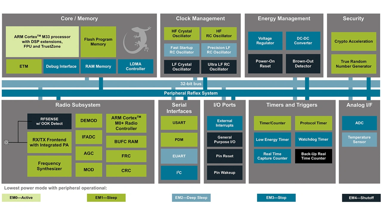 Im aktiven Modus – EM0 – bei 76,8 MHz und 3 V unter Verwendung des internen DC/DC-Wandlers zieht das SoC 27 μA/MHz. EM0 ist der normale Betriebsmodus und der einzige, in dem der Cortex-M33-Prozessorkern und alle Peripherieblöcke verfügbar sind.