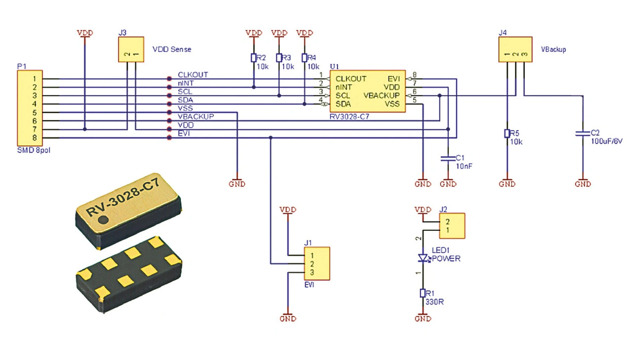 Bei der Software von Cymbet sind die Registereinstellungen nicht ersichtlich. Wahrscheinlich, weil es sich hierbei um eine Demoversion handelt. Eine andere Softwareversion war jedoch nicht erhältlich. Also wurde das Design für den Raspberry Pi mit der RTC von MicroCrystal (»RV-3028-C7«) durchgeführt.
