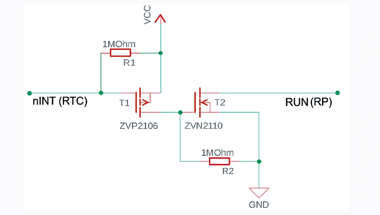 Das Ausgangssignal der RTC (»nINT«) gelangt an den Gate-Anschluss des als Inverter geschalteten PMOS-Transistors T1. Wird das nINT-Signal Low, wird der Drain-Anschluss von T1 High, der mit dem Gate-Anschluss des NMOS-Transistors T2 verbunden ist. So wird der RUN-Anschluss des Raspberry Pi auf GND gezogen. Anschließend startet der Pi-Rechner neu, kann eine Messung ausführen und geht nach Abschluss der Messung über einen Softwarebefehl wieder in den energiesparenden Shutdown-Modus, bis er über ein Signal der RTC wieder gestartet wird und seine nächste Messung durchführt.
