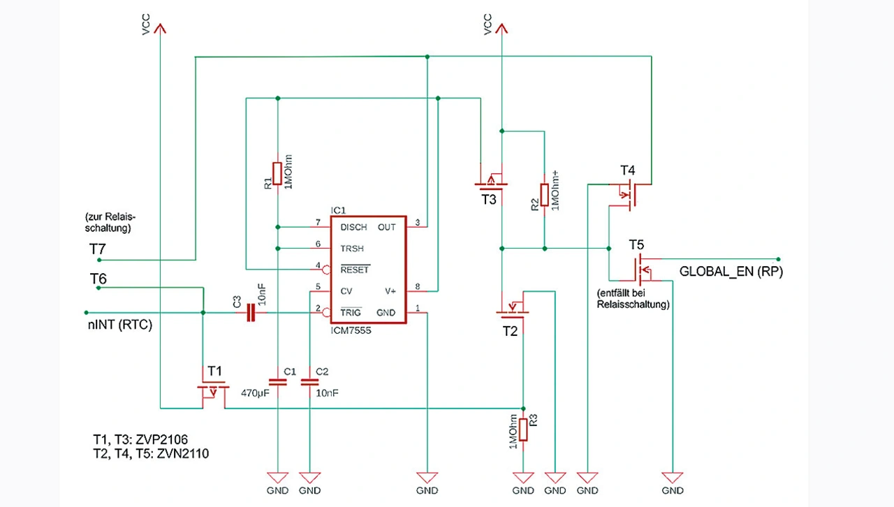 Der Transistor T7 ist über den Blockkondensator C4 mit dem OUT-Pin des ICM555 verbunden, um keinen Stromverbrauch des ICM555 zuzulassen. Sobald die Transistoren durchgeschaltet werden, entladen sich die Kondensatoren C5 und C6 und liefern so den benötigten Schaltimpuls für das Relais. Ohne die beiden Kondensatoren ist kein ausreichend hoher Stromfluss zum Schalten des Relais gewährleistet. Das Gate der beiden Transistoren ist über die Pull-up-Widerstande R4 und R5 mit der Versorgungsspannung der Knopfzelle verbunden.