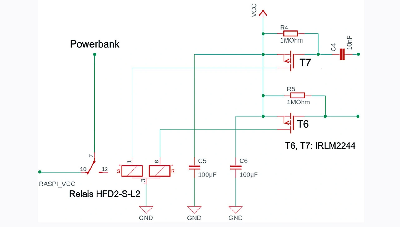 Um ein Relais schalten zu können, wird die Schaltung aus Bild 4 geringfügig geändert und ergänzt. Der Transistor T4 entfällt. Stattdessen wird die Leitung vom Gate des Transistors T4 über einen Transistor T7 auf das Relais geführt, was als Ausschaltsignal fungiert. Als Einschaltsignal wird das RTC-Signal über einen Transistor T6 auf das Relais geführt.
