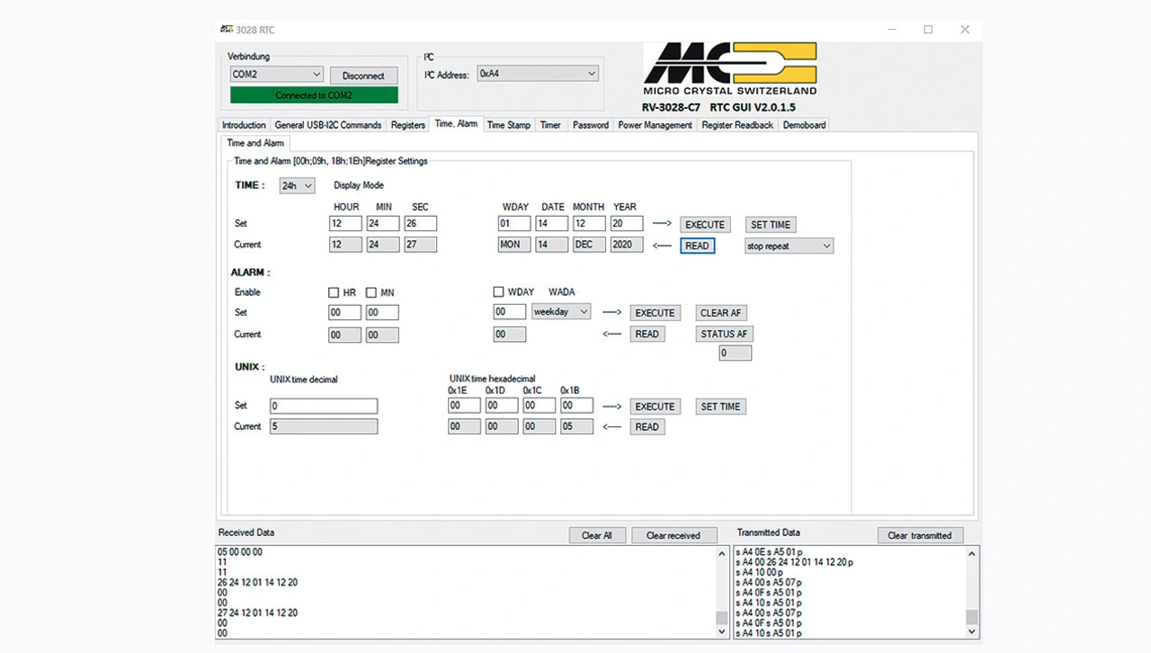 Beim Erproben zeigte sich die Software (Bild 2) von MicroCrystal als besonders komfortabel, denn alle Funktionen und Variablen sind in einer übersichtlichen grafischen Oberfläche dargestellt. Sie bietet zudem einige »Annehmlichkeiten«, beispielsweise, dass sie die Systemzeit des Computers automatisch in die passenden Register der RTC schreibt.