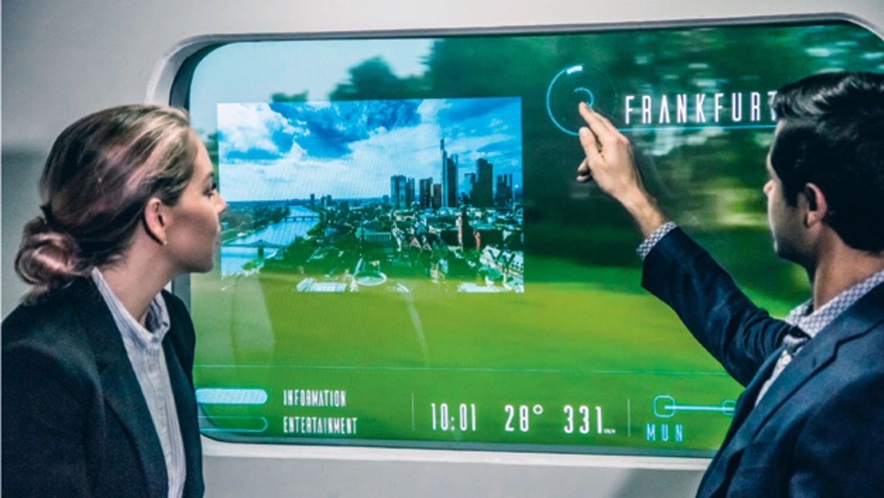 Elon Musk brachte für sein Hyperloop-Projekt die Idee ins Spiel, anstelle von Fenstern große Displays einzubauen, die die vorbeirasende Landschaft zeigen. In einem Geschoss, das in einer abgeschlossenen Röhre fährt, sorgt das für eine schöne Illusion – die Deutsche Bahn hat aber noch echte Fenster mit realen Landschaften dahinter. Trotzdem hat sich die Bahn für ihren »Innovation Train« etwas von Hyperloop abgeschau: Die Einspiegelung von Display-Inhalten in die Fenster. Statt künstlicher Landschaften könnten auch Informationen über den nächsten Halt und die Anschlussverbindungen angezeigt werden – ähnlich wie bei Head-up-Displays im Auto oder Augmented-Reality-Anwendungen.