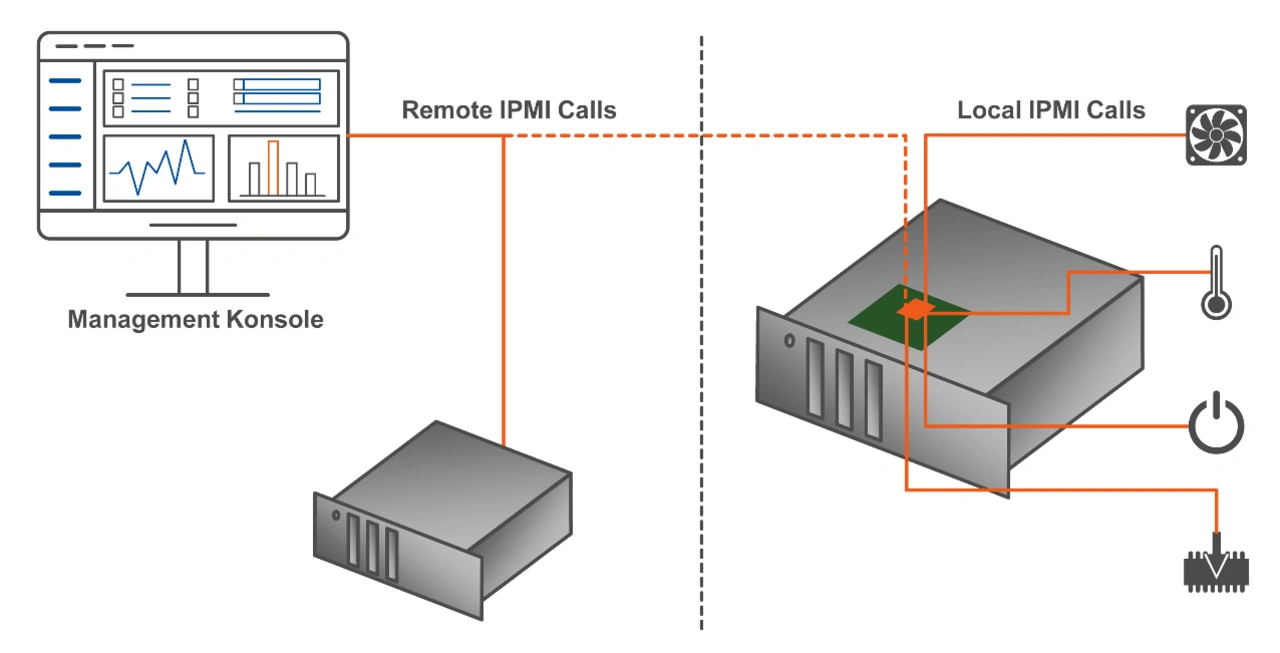 Die IPMI-Spezifikation definiert Protokolle, Schnittstellen und Architektur eines Computer-Subsystems – genauer für das Überwachen und Verwalten des Systems. IPMI standardisiert das Format zur Beschreibung einer Low-Level-Hardware sowie zum Senden und Empfangen von Nachrichten von einem Board Management Controller (BMC). IPMI-Nachrichten können entweder über das Netzwerk an den BMC des Remote-Systems oder von einem BMC an ein lokales Subsystem – beispielsweise eine Stromversorgung – gesendet werden. Weil das System in Bezug auf den Versand von IPMI-Nachrichten sehr vielseitig ist, lassen sich komplexe Managementaufgaben einfach in mehrere Teilbereiche unterteilen. So können die Nachrichten den aktuellen Zustand der Hardware abfragen oder den BMC zu einer Aktion veranlassen – zum Beispiel, die Systemkühlung zu steigern, Systemneustarts auszuführen oder einen Sensor auszulesen (Bild 1). Ein Verlagern von Managementaufgaben auf eine dedizierte physische Hardwarekomponente entlastet Host-Hardware und Betriebssystem.