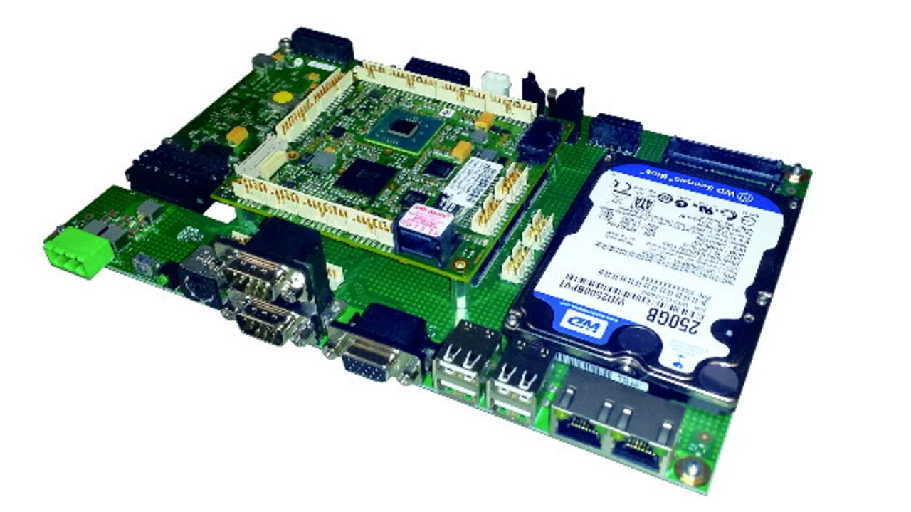 Das Schnittstellenangebot umfasst zwei GBit/s-LAN-, acht USB-2.0- und zwei RS232-COM-Ports, PS/2-Anschlüsse für Tastatur und Maus sowie ein 7.1-Kanal HD-Audio-Interface mit optionalem SPDIF-Ein-/Ausgang. Zur Datenspeicherung sind zwei SATA-3-GBit/s-Kanäle mit RAID(0/1)-Support vorhanden. Über den Typ-2-PCIe/104-Steckverbinder auf der Unterseite der Baugruppe stehen zwei weitere SATA-3-GBit/s-Kanäle, zwei USB-2.0-Ports und ein optionaler PCIe-Minicard-Sockel zur Verfügung. Über das feste Routing von Versorgungsspannung und Datenleitungen auf der kundenspezifischen ADL-Trägerplatine – ist ein komplett kabelloser Betrieb von zwei Massenspeichern HDD/SSD oder einem USB DoM (Disk on Module) möglich.