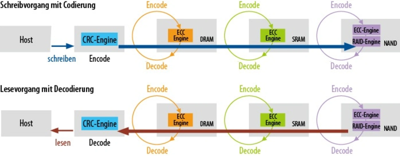 So wird eine gefährliche Lücke bei den internen Transferpuffern aus SRAM bzw. DRAM und auf anderen Signalwegen geschlossen. Datenfehler, die zwischen NAND-Schnittstelle und Host auftreten, z. B. Bits mit Soft-Errors, sind häufig nur äußerst schwierig zu erkennen und zu reproduzieren.