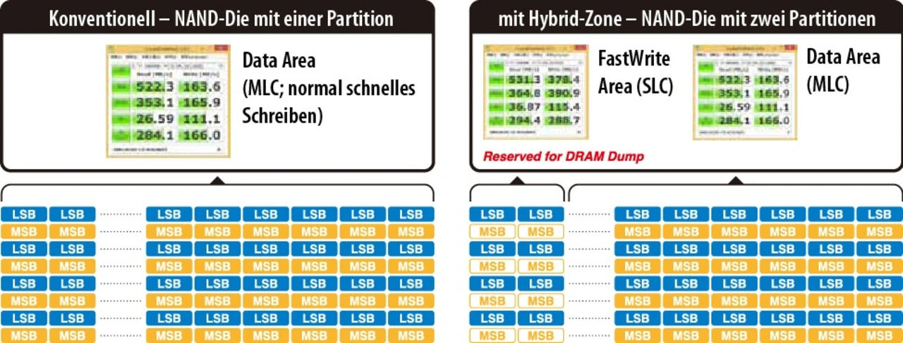 Hybrid Zone, ein weiteres Feature der PCIe FerriSSD, soll die niedrige Latenz der SLC-Zellen mit der hohen Speicherdichte der TLC-Zellen kombinieren. Es partitioniert ein NAND-Die in verschiedene SLC- und MLC/TLC-Bereiche. Ein Medium zu partitionieren ist bei SSDs mit niedriger bis mittlerer Dichte besonders sinnvoll.