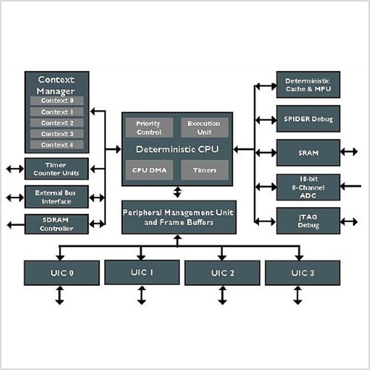 Der Kommunikations-Controller integriert fünf Hardware-Kontexte, die ein schnelles Multithreading vergleichbar mit einem Echtzeitbetriebssystem ermöglichen. Den diversen Aufgaben wie etwa Interrupts, den Kontexten, der DMA, dem Peripherie- Datentransfer und den externen Bus-Mastern werden entsprechend ihrer Wichtigkeit unterschiedliche Prioritäten zugeteilt.