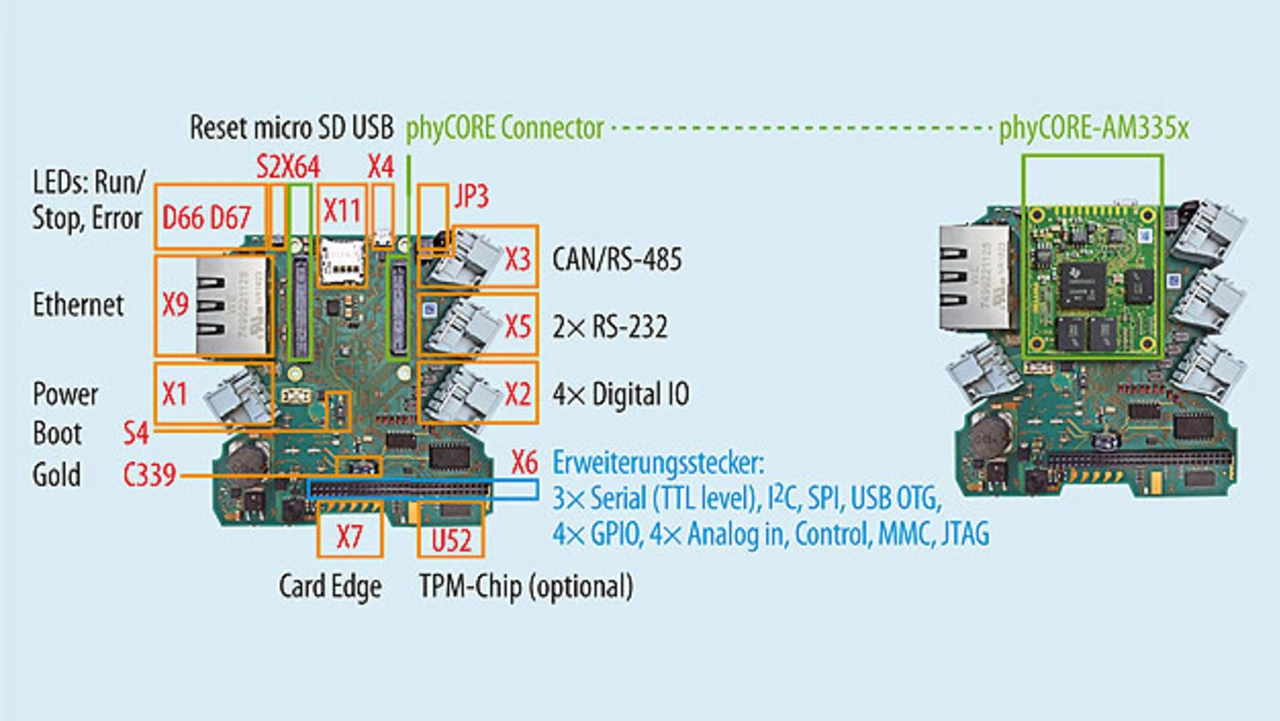 Das phyBOARD-Regor (Bild 1) hat Phytec für den Einsatz in Hutschienengehäusen entwickelt. Gebräuchliche Schnittstellen wie Ethernet (2×), CAN, RS485 und RS232 sind auf dem Board bereits ausgebaut und lassen sich über eine 60-polige Expansionsleiste zusätzlich erweitern. Optimal also für den Einsatz als Serienprodukt oder als erstes Funktionsmuster, anpassbar an unterschiedliche Einsatzzwecke. Die Rechenleistung für gängige Anwendungen stellt ein phyCORE System-on-Module mit AM335x-Prozessor von Texas Instruments zur Verfügung. Sämtliche EMV-kritischen Komponenten sind bereits auf dem Modul integriert. Der Single Board Computer wird inklusive eines Linux/Yocto Board Support Packages ausgeliefert. Auf Wunsch ist das phyBOARD-Regor bereits als Application Ready Embedded Controller in einem Hutschienengehäuse und/oder inklusive Logi.cals Soft-SPS-Lösung erhältlich.