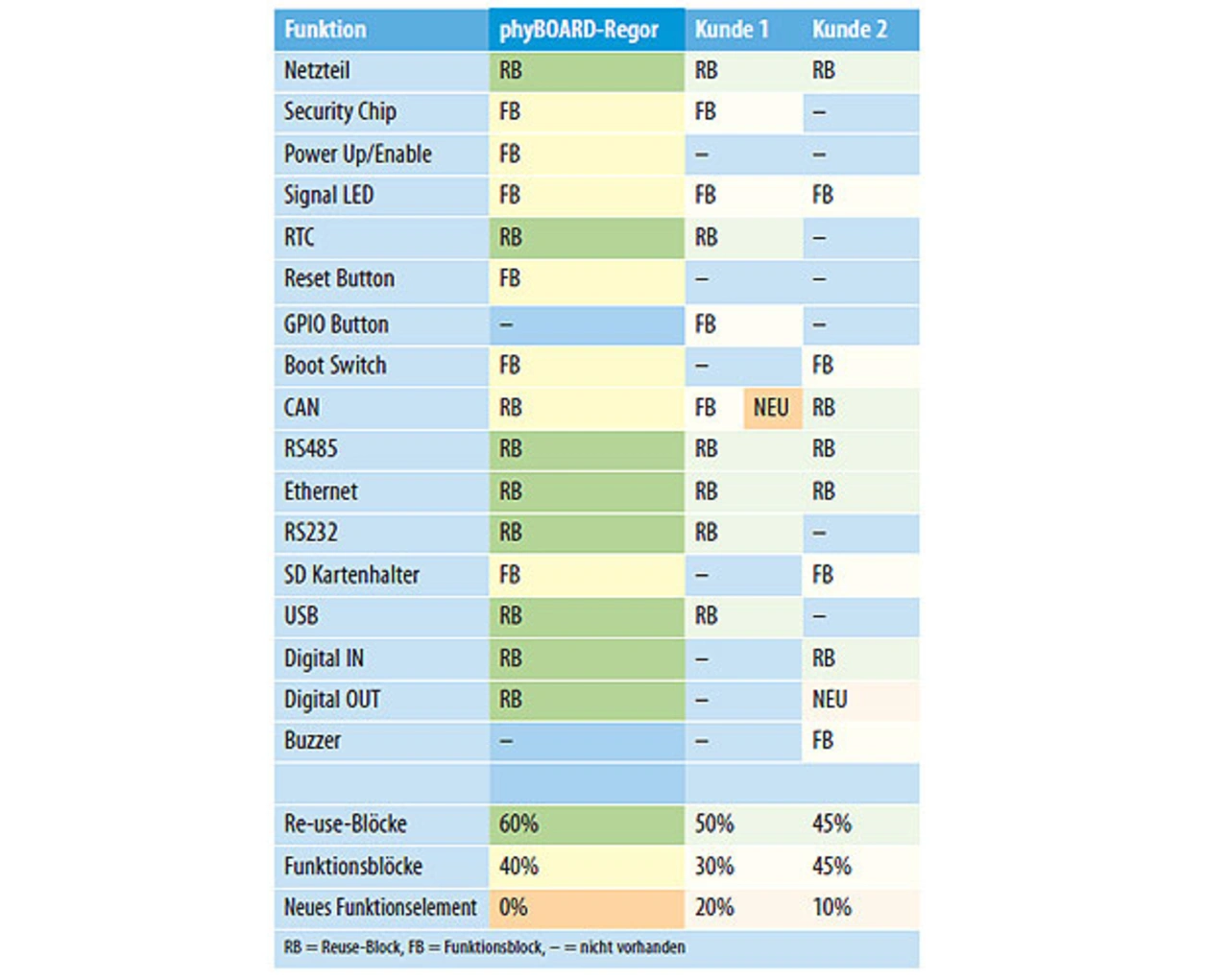 Kunde 1 überzeugten die grundlegenden Eigenschaften des phyBOARD-Regor, die den Vorstellungen für die Serien-Hardware entsprachen. Der Formfaktor und das mit dem SBC angebotene Gehäuse sollten erhalten bleiben. Trotzdem ergaben sich in der Funktionsmusterphase umfassende Änderungswünsche für die verwendeten Funktionsblöcke. So sollte beispielsweise die RS485-Schnittstelle galvanisch getrennt werden. Außerdem wünschte der Kunde die Bestückung einer zusätzlichen, kundenspezifischen seriellen Schnittstelle. Tabelle 1 zeigt die Änderungen gegenüber dem Standard-SBC.