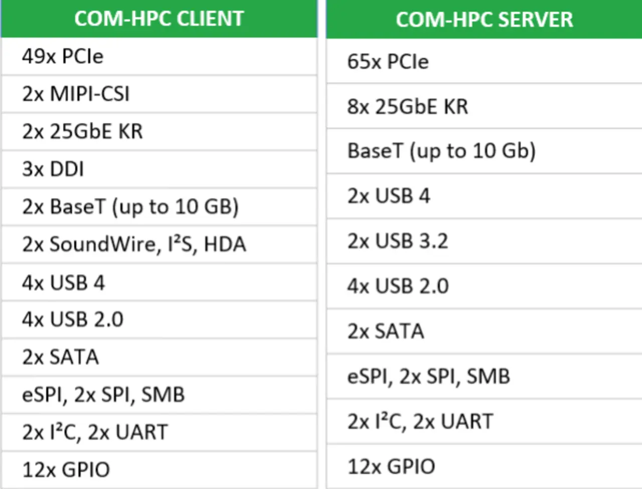Die Server-Module bieten eine große Anzahl an PCIe Lanes und Ethernet-Schnittstellen sowie Platz für große Speicherarrays und Kühlmodule. Insgesamt stehen bis zu 65 PCIe Lanes bereit, beispielsweise für den Anschluss von Hardwarebeschleunigern und Massenspeicher. Zudem unterstützen die Module bis zu acht KR-Ethernet-Schnittstellen, wobei die Bandbreite pro Port je nach Implementierung von 1 Gbit/s (z. B. 1000Base-KX) bis25 Gbit/s (z. B. 25GBase-KR) skalierbar ist. Zusätzlich ist ein BASE-T-Port mit bis zu 10 Gbit/s Bandbreite (10GBASE-T) für Managementaufgaben definiert.
