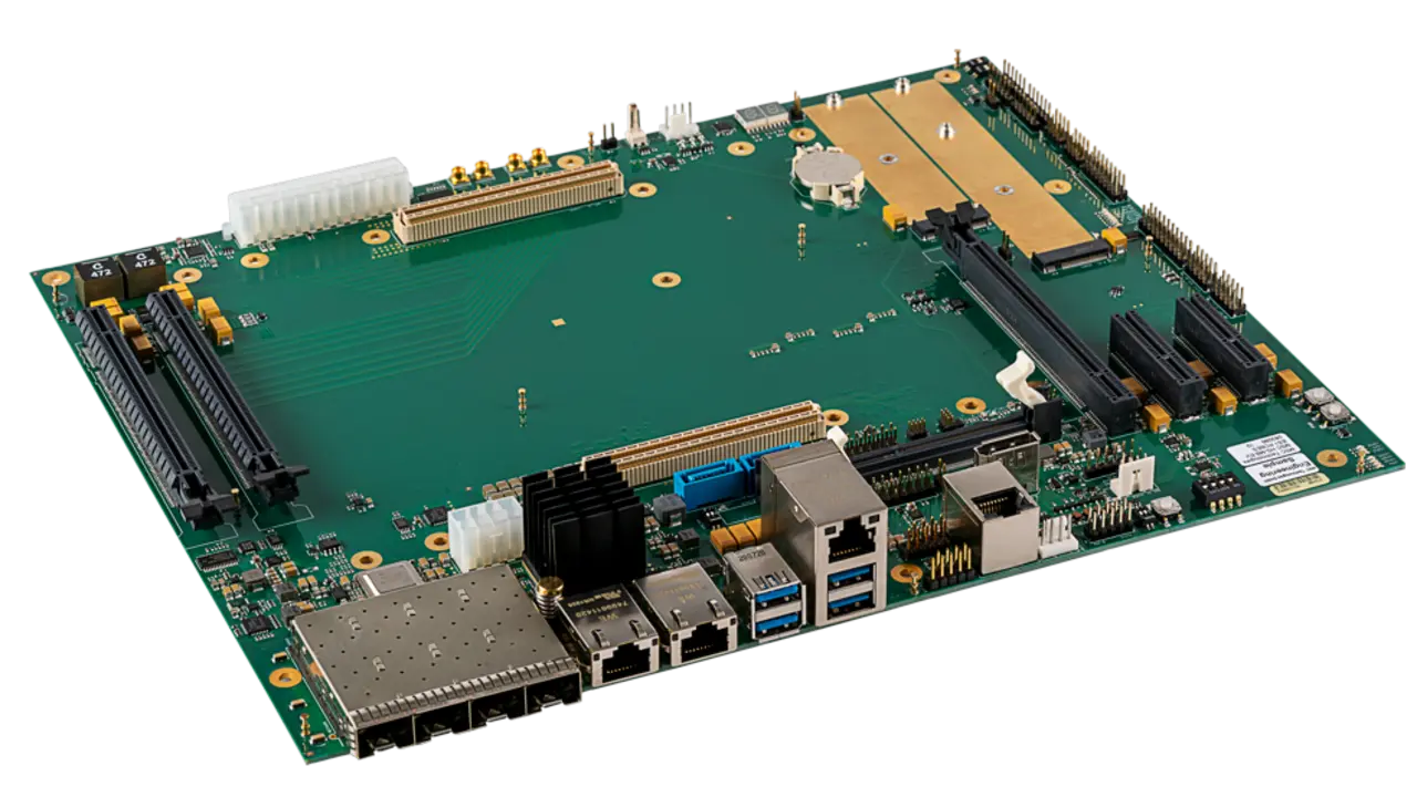 Das Carrier Board im ATX-Formfaktor misst 305 mm x 244 mm und bietet viele Erweiterungsoptionen: einen PCIe x16 Slot, je zwei PCIe x8 und x4 Slots sowie zwei M.2 Slots mit PCI x4. Alle vorhandenen PCIe Slots unterstützen bis zu Gen 4. Zur Anbindung an das Netzwerk sind vier »SFP28«-Kartenkäfige vorhanden. Sie unterstützen bis zu 25G Ethernet pro Port, zwei 10GBASE-T-Konnektoren und einen 1000/2.5GBASE-T-Konnektor. Speichermedien werden über zwei SATA-Anschlüsse mit bis zu 6 Gbit/s integriert. Externe Geräte lassen sich über je zwei USB 3.2 Gen 2 (10 Gbit/s) und USB 3.2 Gen 1 (5 Gbit/s) anschließen. Zusätzlich stehen zwei UART Ports, ein Konnektor mit zwölf GPIO Ports und Anschlüsse für ein optionales Board Management Controller (BMC)-Modul und I/O Break-out bereit. Ein über Pulsweitenmodulation (PWM) gesteuerter 4-Pin-Anschluss für einen Lüfter ist ebenfalls vorgesehen.
