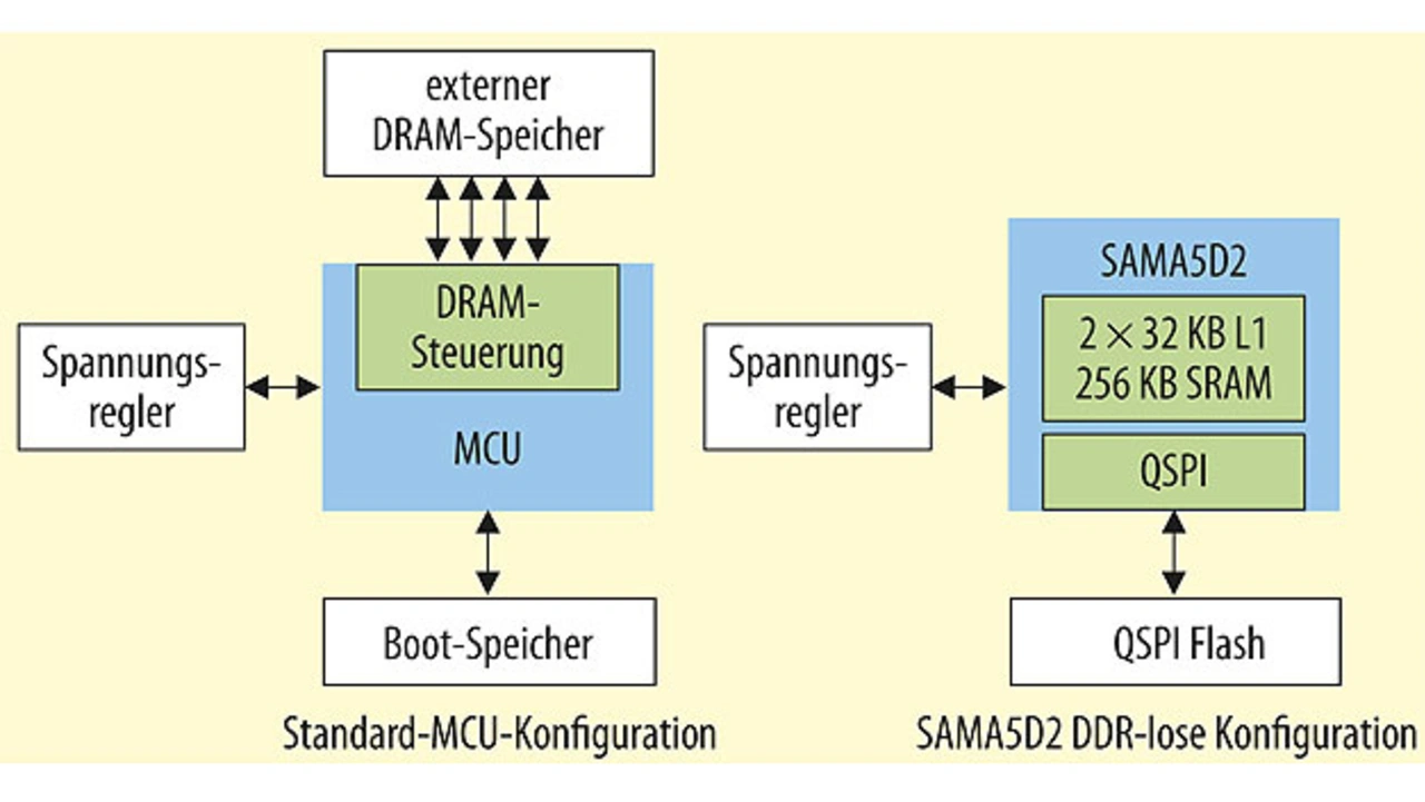 Der Atmel SAMA5D2 enthält einen internen 160-KB-Festspeicher mit einem standardmäßigen und einem sicheren Startprogramm sowie BCH-Code-Tabellen für die NAND-Flash-ECC-Korrektur. Der 5 KB große SRAM des Mikrocontrollers wird durchgehend überwacht, um Angriffe zu vermeiden. Davon ist ein Bereich von 1 KB bei Manipulationserkennung nicht löschbar. 4 KB verfügen über Non-Imprinting-Unterstützung und 245 Register, die bei einer Manipulationserkennung löschbar sind. Da das Bussystem Quad-SPI unterstützt, kann der Entwickler für sein Embedded-System serielle Flash-Speicher nutzen, die eine gute Alternative zu dem größeren und teureren parallelen Flash-Speicher darstellen. Durch die XIP-Unterstützung (Execute In Place) kann ein Code direkt von einem seriellen Flash-Speicher ausgeführt werden, was eine Echtzeitbetriebssystem-optimierte Konfiguration erlaubt (Bild 1).