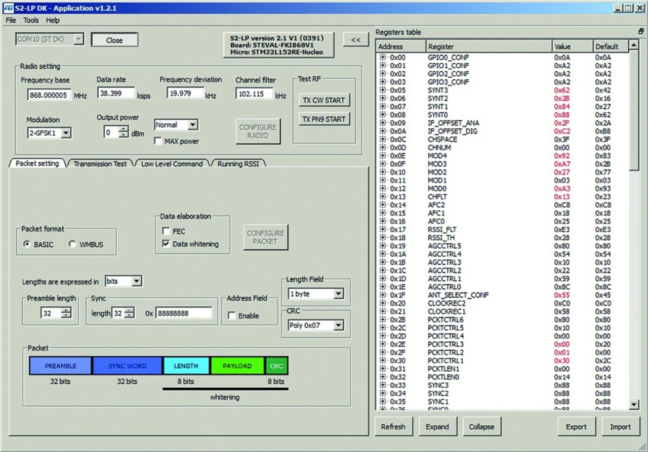 Der Transceiver wird als typischer Low-Power-Sub-1-GHz-Transceiver angeboten, unterstützt Modulationen wie ASK, OOK, 2-FSK und 4-FSK, und die Datenrate ist von 0,1 bis hin zu 500 kbps programmierbar. Im »Dokument Getting started with the S2-LP development kits« [4] ist erläutert, wie das System aufgebaut ist, wie es in Betrieb genommen wird, welche Software notwendig ist und wie Einstellungen über die S2-LP-Gui vorgenommen werden. Nach dem Anschluss des Systems an den USB eines PC wird es wie üblich als virtueller Com-Port detektiert.