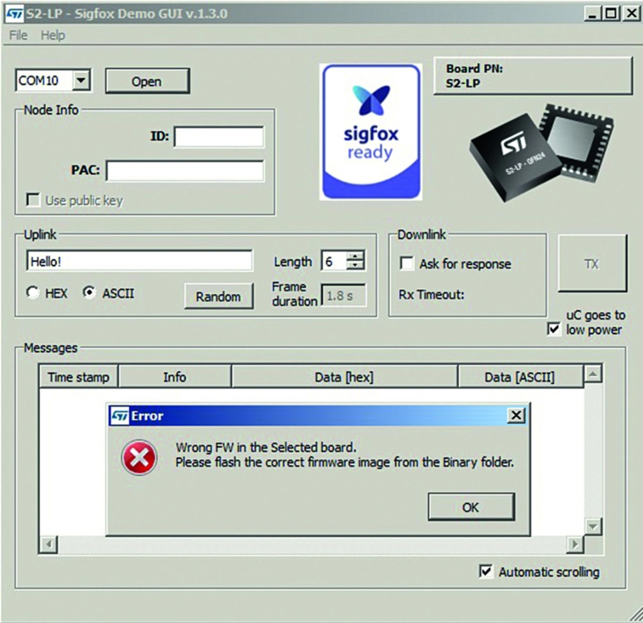 Es bedarf schon einiger Sucherei, bis man bei STM dann auf das »User Manual Getting started with the sigfox S2-LP kit «[5] stößt. Hier ist dann auch beschrieben, wie man die für Sigfox notwendige Firmware auf das Nucleo-Board schreibt. Allerdings befindet sich die laut Dokumentation benötigte bin-Datei nicht mit im Lieferumfang der Software (S2_LP_SigFox_DK_Setup-1.3.0), stattdessen vier andere bin-Dateien, deren Einsatzzweck aber nicht dokumentiert ist. Sie ließen sich zwar alle problemlos flashen, die Sigfox-Demo-Gui reagierte allerdings stets mit einer Fehlermeldung (Bild 5). Dieses Problem ist bereits seit April 2018 in der STM-Community bekannt, die Antworten von STM dazu beschränken sich auf Hinweise zur Dokumentation, was einen nicht weiterbringt.