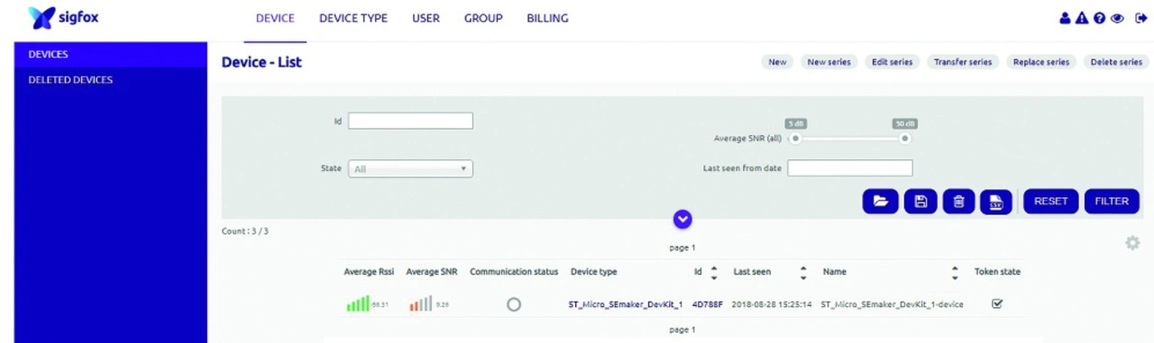 Hilfreich war in dieser Situation Sigfox in Grasbrunn, die den Kontakt zum zuständigen Mitarbeiter bei STM vermittelt haben, und nach einigem Hin- und Her (STM: Die Firmware-Files müssten eigentlich alle mit dem Kit funktionieren …) erhielten wir dann ein neues Steval-FKI868-Kit, allerdings in der Version V2 statt V1, was dann auf Anhieb funktioniert hat, d. h., statt der Fehlermeldung nach dem Flashen wurde sofort der Registrierungsprozess gestartet. Während dieses Vorgangs erhält man von STM per Email einen Activation-String, der beim zweiten Schritt des Registrierungsprozesses in das entsprechende Feld zu kopieren ist, was letztlich dazu führt, dass das Gerät dann registriert ist und im Sigfox Backend auftaucht (Bild 7). Der gesamte Vorgang ist erfreulicherweise in wenigen Minuten unter Angabe der ID und der PAC des Boards erledigt (vgl. [1]).