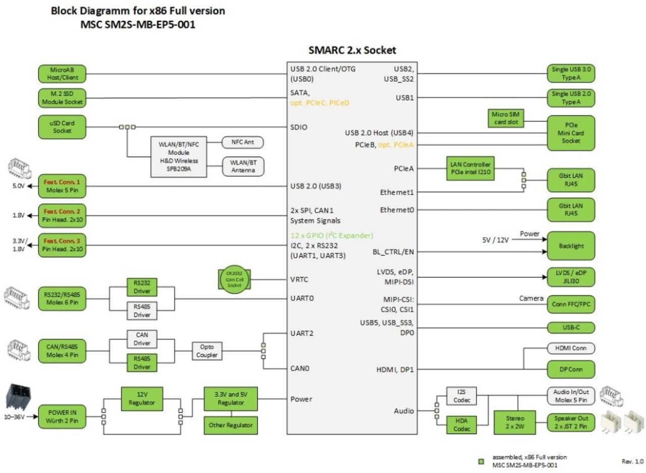 Das SimpleFlex Carrier-Board MSC SM2S-MB-EP5 bietet zahlreiche, in der Industrie gängige Schnittstellen, z. B. 2× Gigabit Ethernet, USB 3.0, USB 2.0, 4× UART (als TTL, RS-232 oder RS-485), Audio mit 2,5-W-Stereoverstärker, 2× MIPI-CSI, 12× GPIO, 2× SPI, I2C und zwei CAN-Ports, wovon einer optional isoliert ist (Bild 2). USB Type-C ist nicht nur als USB 3.1 mit bis zu 10 GBit/s sondern auch im Alternate-Mode für den Anschluss externer Monitore mit DisplayPort geeignet. Daneben sind auf der Plattform die Grafik-Interfaces DisplayPort oder HDMI vorhanden. Displays können wahlweise über LVDS, MIPI-DSI oder eDP angesteuert werden.