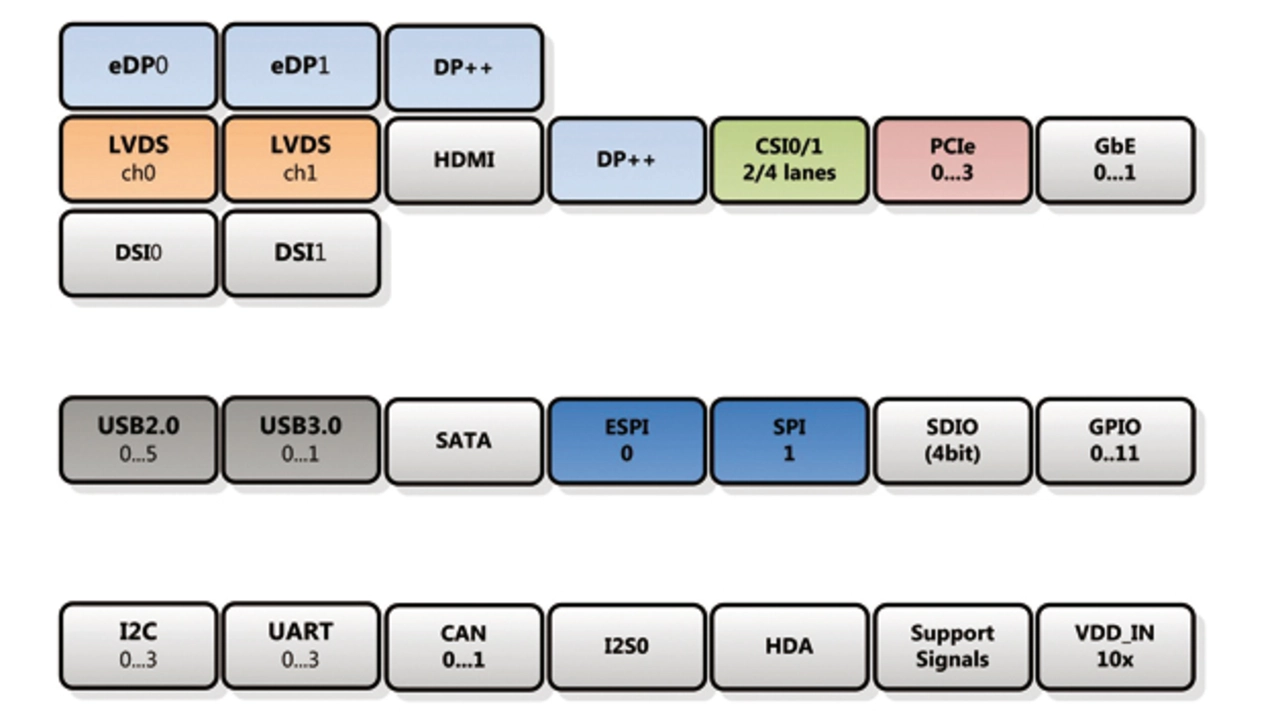 Sollten diese oder weitere dedizierte Interfaces nicht ausreichen, stehen für plattformspezifische Erweiterungen nun nicht nur drei, sondern vier PCIe-Lanes zur Verfügung, was die Flexibilität für individuelle Funktionserweiterungen entsprechend erhöht. Dabei sind drei PCIe-Lanes rückwärtskompatibel zu SMARC 1.1. Einer der beiden SPI-Busse hat zudem ein Upgrade auf eSPI/SPI erfahren und anstelle dreifach I2S (mit HDA-Option auf I2S2) sowie SPDIF wird nun 1 x I2S (für ARM-Designs) und 1 x HDA (für x86-Designs) unterstützt. Der Support von HDA bietet Vorteile bei der Integration, da HDA-Codecs eine höhere Standardisierung bieten, als I2S. Weil I2S aber weiterhin unterstützt wird, geht die Flexibilität und höhere Energieeffizienz dieses Busses nicht verloren.