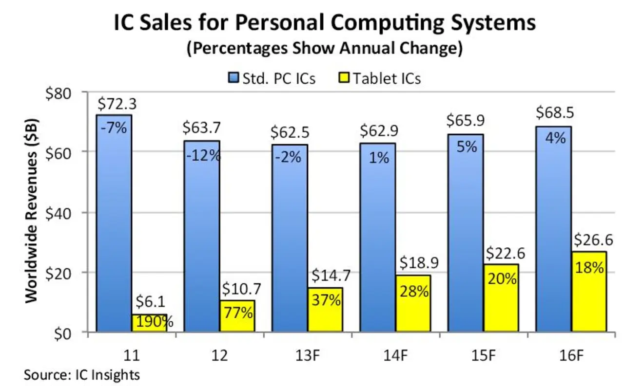 Die Anzahl der verkauften Tablets steigt voraussichtlich sogar um 62 % von 117 Mio. auf 190 Mio. verkaufte Geräte. Da primär die „kleinen“ Geräte mit 7- und 8-Zoll-Display wachsen, sinkt der durchschnittliche Wert der eingebauten Chips auf ca. 77,5 Dollar – PCs erzielen einen rund 2,3 mal so hohen Chip-Umsatz pro Gerät, was nicht nur daran liegt, dass die ARM-basierten SoCs sowieso billiger sind als x86-Prozessoren, sondern auch noch höher integriert sind: GPU und System-Funktionen finden sich auf einem Chip statt getrennt mit einem zusätzlichen Chipset. Dazu beinhalten Tablets auch noch weniger RAM-Speicher und ersetzen Festplatten/SSDs durch NAND-Speicher.