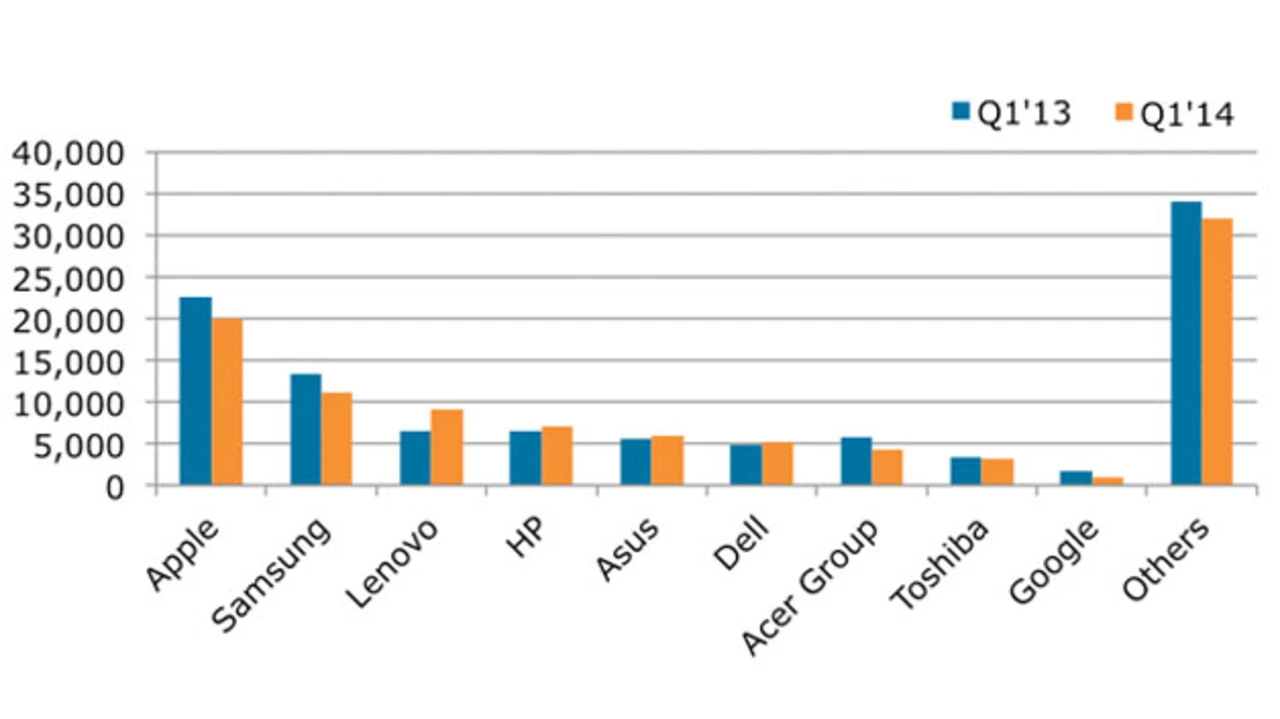 Tablet-Computer machen inzwischen mehr als die Hälfte des Umsatzes mit Mobilcomputern aus. Allerdings wurden im ersten Quartal 2014 nur noch 56,3 Millionen Tablets verkauft, im ersten Quartal 2013 waren es noch 59 Millionen Stück. Das ist ein Rückgang von 5 Prozent. Um diesen Wert sank auch die Zahl mobiler Computer insgesamt im Jahresvergleich: von 104,4 Millionen auf 99 Millionen Geräte im jeweils ersten Quartal 2013 bzw. 2014. Standard-Notebooks brachen besonders stark ein, um 14 Prozent, was allerdings durch ein Wachstum bei ultra-dünnen Notebooks teilweise wieder aufgefangen wurde.