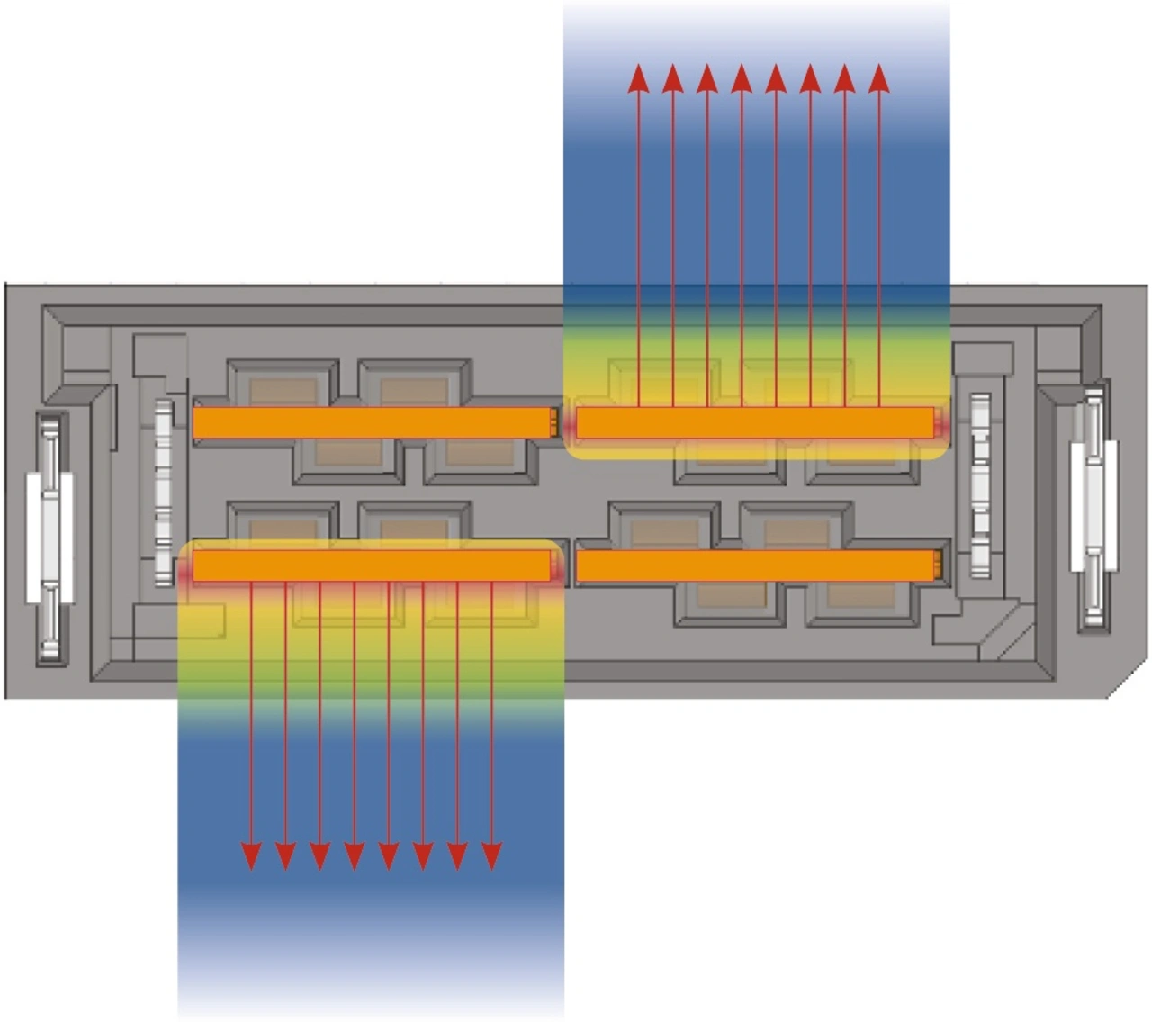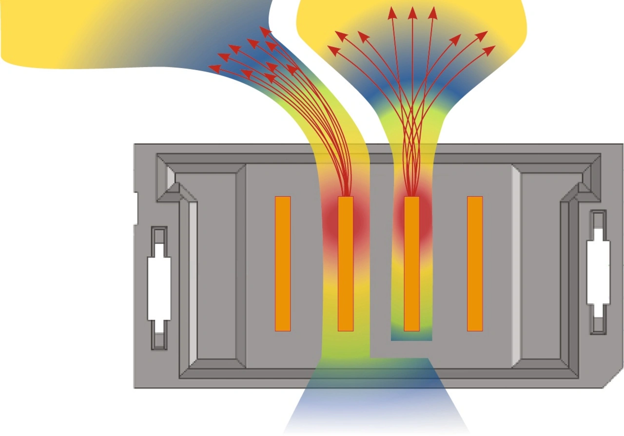 Bei herkömmlichen Steckverbindern befinden sich die Messerleisten in einer Linie zur Breite des Isolators. Diese Ausführung erhöht die Wärme der benachbarten Messer und behindert die Kühlung. Bei allen inneren Messern kann die Wärme nur vertikal oder seitlich entweichen, was zu Current Crowding führt.