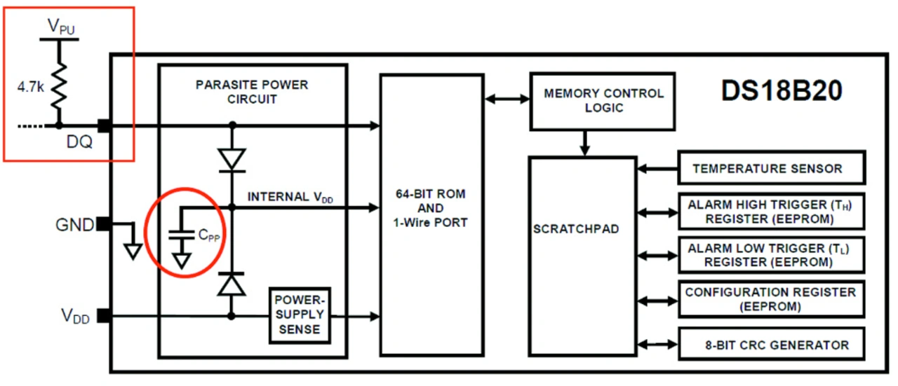 Die Kondensatorkapazität (typischerweise 800 pF bis 100 nF) ist so bemessen, dass sich mindestens ein Low-Zyklus überbrücken lässt. Eine solche Form der Energieübertragung bezeichnet man als »parasitic power« oder als parasitäre Spannungsversorgung. Über eine (interne) Diode lässt sich verhindern, dass sich die Kapazität in den Low-Phasen entlädt. Um die kapazitive last nicht zu stark zu erhöhen, wird eine Schottky-Diode verwendet. Sie besitzt nicht nur eine geringe parasitäre Kapazität, sondern verursacht ebenso lediglich einen geringen Spannungsabfall.