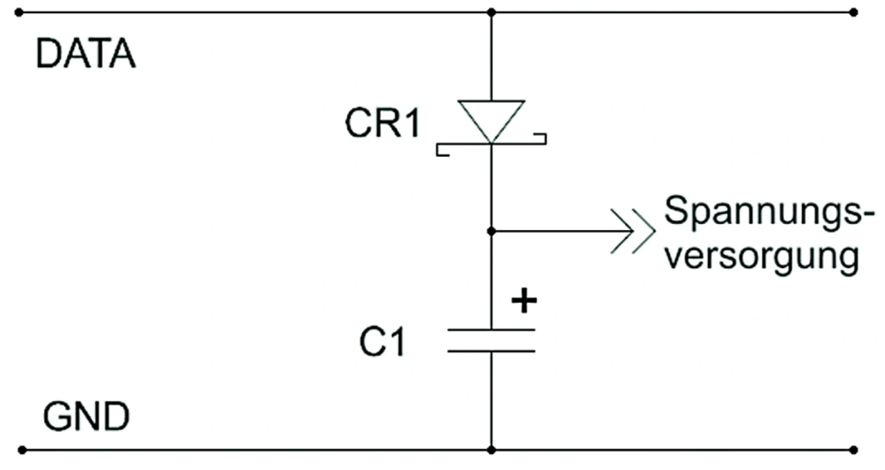 Der One-Wire-Trick liegt gewissermaßen in den speziellen Chips. So sind sowohl die Daten als auch die Spannungsversorgung über einen einzigen Anschluss zu führen. Obwohl es One-Wire heißt, benötigt man noch eine zweite Leitung für die Schaltungsmasse (GND). Gleichwohl ist One-Wire damit ein einzigartiges System. Einige der One-Wire-Chips verfügen über einen VDD-Pin für den Anschluss einer Spannungsversorgung, was als Option oder für den Test gedacht ist, denn im Prinzip ist er nicht notwendig. Das One-Wire-Prinzip lässt sich ebenso für eigene Entwicklungen adaptieren. Hierfür setzt man ein ähnlich einfaches Protokoll ein und baut für die Spannungsversorgung eine separate Schaltung (Bild 2) auf. So lässt sich die nötige Versorgungsspannung für einen digitalen Sensor aus dem Datenstrom beziehen.