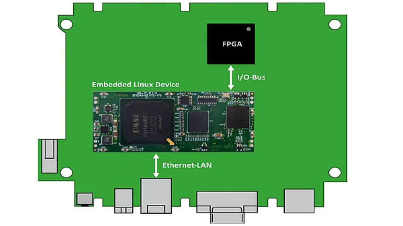 Zwischen dem FPGA und dem Ethernet-LAN ist ein Embedded-Linux-Rechnermodul zu finden, auf dem eine in C/C++ erstellte Anwendersoftware läuft. Bis auf wenige digitale I/Os nutzt diese Software sowohl für FPGA-I/O-Buszugriffe als auch die LAN-Kommunikation ausschließlich das Treiberkonzept des Embedded-Linux-Betriebssystems.