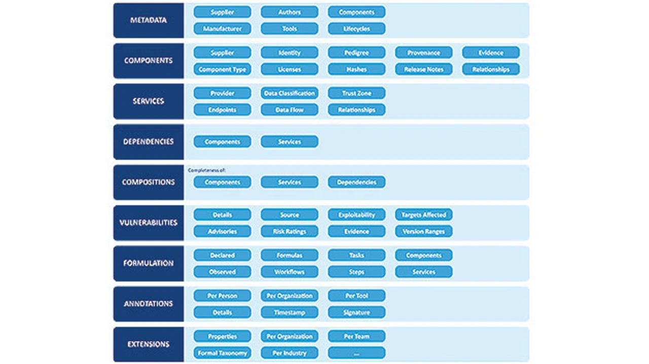 [4] Webseite zu den CycloneDX-Bausteinen (beachte die neun Bereiche einer CycloneDX-SBOM mit Abbildungen): https: //cyclonedx.org/specification/overview/