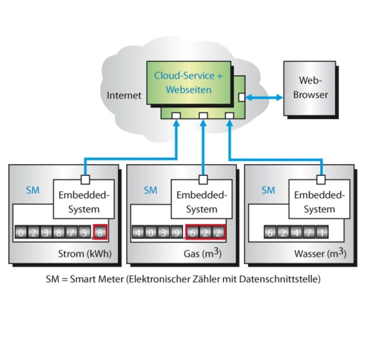 Per Internet nutzbare Cloud-Services erweitern bei Bedarf die Standardfunktionen eines Embedded-Systems. Dadurch ergeben sich erhebliche Einsparungen vor Ort, da nicht mehr jedes einzelne System für die Maximalanforderungen dimensioniert werden muss. Werden zusätzliche Leistungsreserven – wie beispielsweise Speicherplatz für persistente Daten oder Rechenleistung zur Datenauswertung – benötigt, so können diese mit Hilfe eines Cloud-Service zur Verfügung gestellt werden (Bild 3).