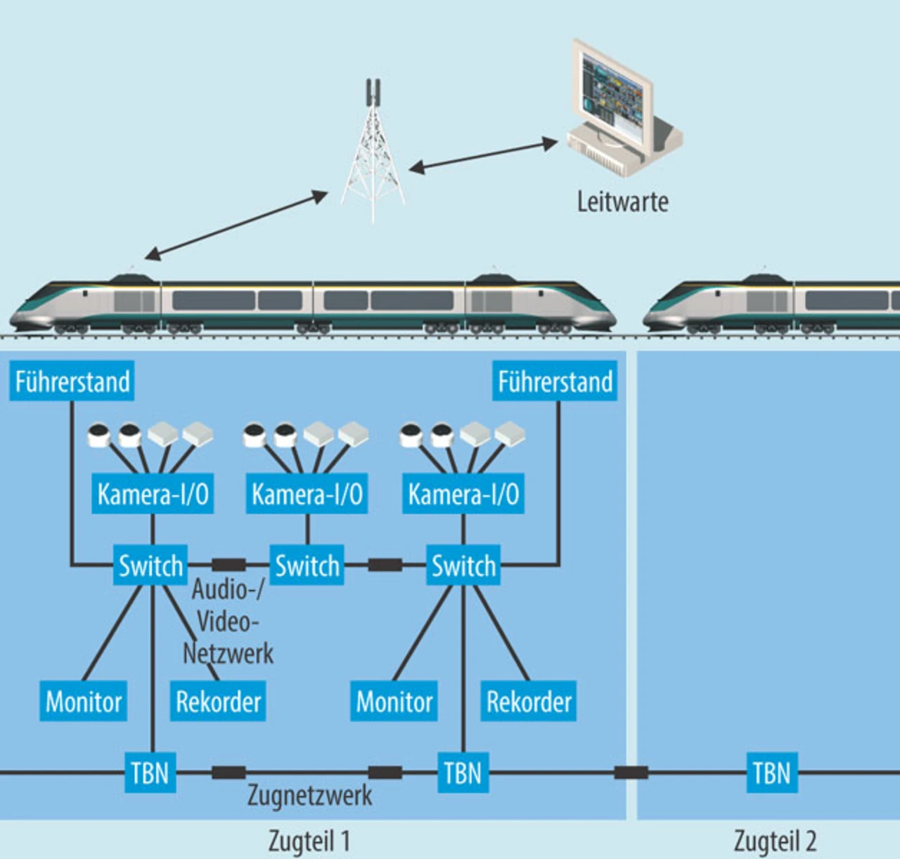 Gemäß dem Entwurf zu IEC 62580-2 müssen Videoüberwachungs-/CCTV-Systeme in Schienenfahrzeugen an das Zugkommunikationsnetzwerk (TCN, Train Communication Network) angebunden sein und Live-Videos müssen an eine Basisstation bzw. an eine entfernt gelegene Leitstelle übermittelt werden (Bild 1).