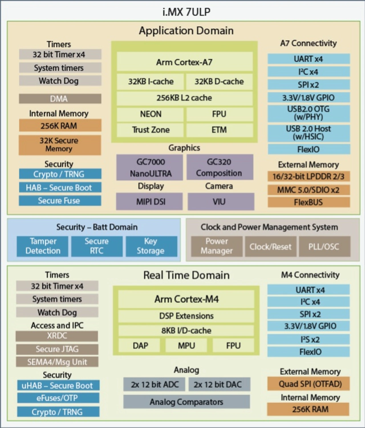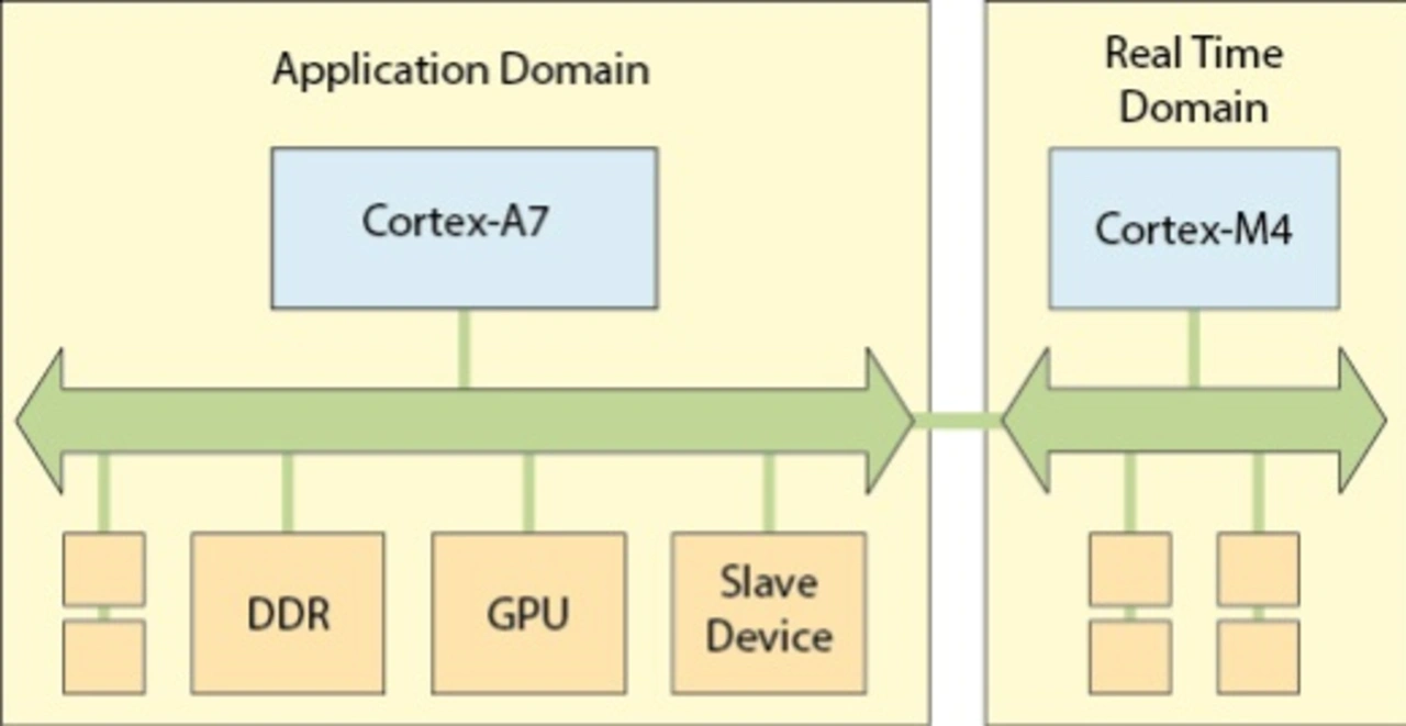 Um Kriechströme zwischen den Power-Domänen zu vermeiden, verfügt der Arm-Cortex-M4 über eigene Peripherieeinheiten (zum Beispiel UART). Diese sind nützlich wenn die Power-Domäne des Arm-Cortex-A7 abgeschaltet ist. Läuft der Cortex-M4, lässt sich natürlich – wie von NXP gewohnt – auf den internen Bus zugreifen. Die Vorteile des Arm-Cortex-M4 sind somit spezielle Low-Power-Funktionen, Echtzeit-Verarbeitung unabhängig vom Linux-Betriebssystem und die Verfügbarkeit von Schnittstellen sofort nach dem Einschalten.