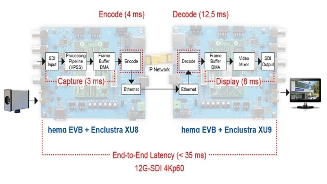Die Ingenieure von Hema Electronic haben die Ultra-Low-Latency-Streaming-Plattform mit kompletter System-Umgebung kundenspezifisch aufgebaut. Auf einem eigens entwickelten Embedded-Vision-Board nutzt das Unternehmen das Ultra-Low-Latency-10-Bit-4:2:2-SDI-Video-Subsystem von Xilinx. Ebenfalls zum Einsatz kommt ein XU8- sowie ein XU9-Modul des Schweizer FPGA-Modulspezialisten Enclustra. »Mit einer schnellen Kamera, einem schnellen Monitor und dem von Xilinx entwickelten Algorithmus für Low Latency erreichen wir mit unserem System Übertragungsraten von weniger als 35 ms«, erläutert Michael Mößmer, Entwicklungsleiter bei Hema Electronic. »Damit sind Verzögerungen bei Bildübertragungen vom menschlichen Auge nicht mehr wahrnehmbar.«