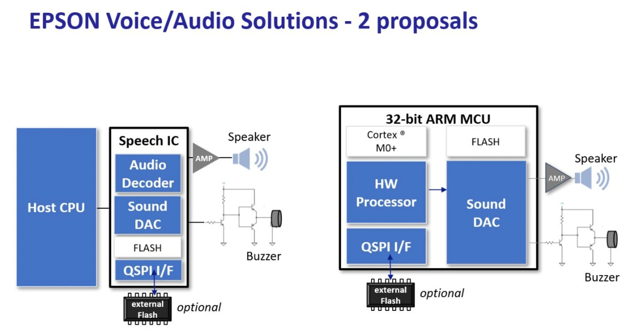 Bild 2 zeigt eine Single-Chip-Lösung auf Basis der 32-Bit-Mikrocontroller-Familie ARM Cortex-M0+, die für die finale Applikation sowie die Speicherung und Ausgabe der erzeugten Sprachdaten zuständig ist. Die Sprach- und Audiodaten lassen sich dabei sowohl im internen Speicher als auch optional in einem externen Flashspeicher ablegen. Aktuell sind die beiden 32-Bit-ARM-Cortex-M0+-Mikrocontroller S1C31D50 und S1C31D51 verfügbar. Die Bausteine haben neben der Core-CPU einen integrierten Sprach- und Audio-Hardware-Prozessor (HWP) sowie einen Sound-DAC. Dies ermöglicht das simultane Abspielen zweier, in ihrer Lautstärke unabhängig kontrollierbarer Kanäle (z.B. Sprache und Musik) mit einer Abtastrate von jeweils 15,625 kHz. Dies ist ein weiteres Alleinstellungsmerkmal der Sprachausgabelösungen von Epson. Typischerweise reduziert man die Musiklautstärke bei einsetzender Sprachausgabe. Die Tonlage und Sprachgeschwindigkeit werden vom speziellen Hardware-Audio-Prozessor kontrolliert, die Geschwindigkeit ist in 5-Prozent-Schritten zwischen 75 Prozent und 125 Prozent regelbar. Zum Abspielen der erzeugten Sprach- und Audiodaten werden lediglich deren IDs in ein Register des Hardware-Prozessors geschrieben. Spezieller Programmcode für die Verknüpfung der Tondateien ist damit nicht nötig, und abgesehen vom Schreiben der IDs sind keinerlei weitere CPU-Ressourcen notwendig - die CPU kann also unabhängig von der Sprachausgabe uneingeschränkt andere Aufgaben übernehmen oder in den Schlafmodus übergehen. Der S1C31D51 unterstützt zudem Sprachausgabe über einen piezoelektrischen oder einen elektromagnetischen Buzzer.