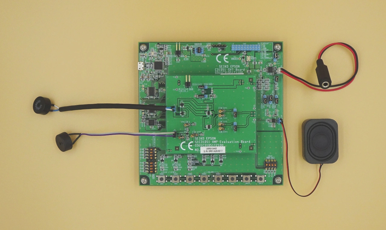 Für Kunden stehen eine Reihe von Evaluation Tools von Epson zur Verfügung. Mit den beiden Evaluation Boards S5U1C31D50T1200 und S5U1C31D51T1100 lässt sich die Qualität der Sprachausgabe über einen Lautsprecher testen. Wer mit dem S5U1C31D51T1100 in Kombination noch das Buzzer Board S5U1C31D51T2100 (Bild 4) nutzt, kann zusätzlich die Qualität der Sprachausgabe über einen piezoelektrischen oder einen elektromagnetischen Buzzer testen.