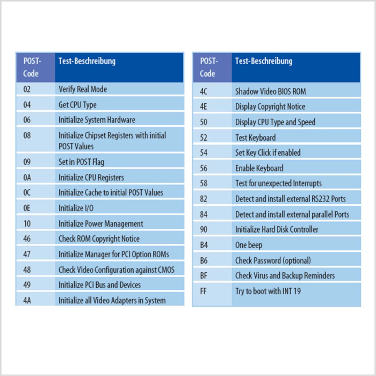 Eine gebräuchliche Methode für die Überprüfung von PC-Hardware ist die Analyse von POST-Codes. POST steht für Power On Self Test, womit die Selbsttestfunktion nach dem Einschalten eines PC gemeint ist. Die hierfür definierten POST-Codes gibt es quasi seit Beginn der PC-Technik, seit dem 80286 – dem Original IBM-AT. Tabelle 1 zeigt einen Ausschnitt aus einer POST-Code-Liste.