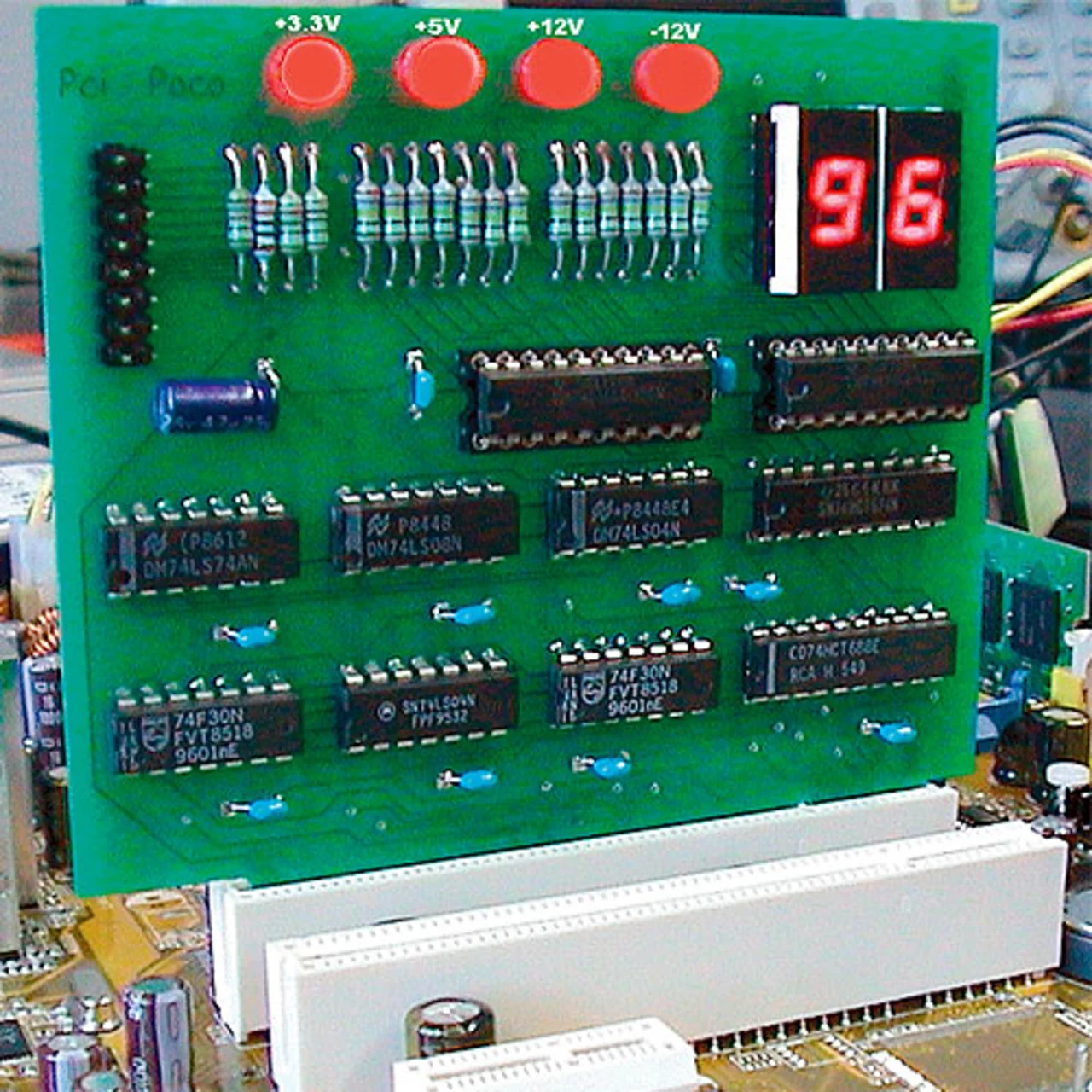 Jeder erfolgreich absolvierte Schritt der Initialisierung wird vom BIOS durch die Ausgabe eines POST-Codes (Hex-Code) an eine bestimmte I/O-Adresse quittiert. Zur Verarbeitung dieser Codes wird eine spezielle Einsteckkarte benötigt, auf der sich im einfachsten Fall Leuchtdioden für die Anzeige befinden. Für die leichtere Identifizierung empfiehlt sich jedoch eine POST-Code-Karte mit einer Siebensegment- oder einer LCD-Anzeige (Bild 1). Im Handel gibt es einfache POST-Code-Karten für den PCI-Bus bereits ab ca. 15 Euro. Je nach Funktionsumfang der Testkarte gehen die Preise hierfür bis weit über 1000 Euro. Zusätzliche Funktionen sind etwa die Messung der Versorgungsspannung und des Bustaktes sowie die Analyse von PCI-Bus-Signalen. Die teureren Modelle arbeiten mit eigenen Prozessoren und können möglicherweise auch „scheinbar tote PCs“ mit einem eigenen BIOS booten.