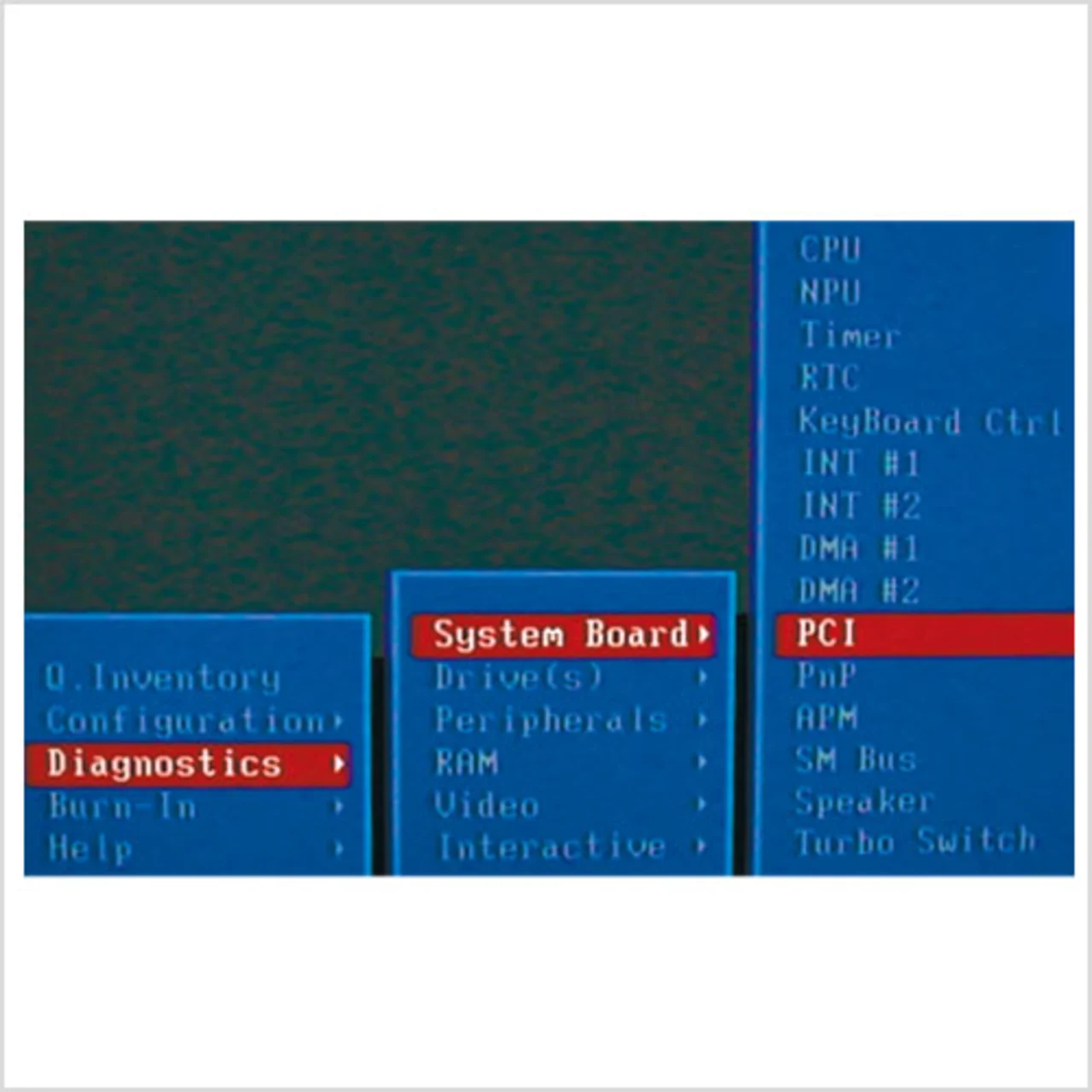 Der Extended Diagnostic Mode startet zunächst ebenfalls mit dem Test der bekannten Komponenten. Auch wenn dies etwas anders aussieht als beim Standard-Modus, handelt es sich um die gleichen Einheiten mit der dazugehörigen Pass/Fail-Information, die hier allerdings nicht über LEDs angezeigt wird. Prinzipiell ist es unwahrscheinlich, dass hier tatsächlich einmal ein Test nicht bestanden wird, weil genau diese grundlegenden Tests bereits zuvor durch das PC-BIOS korrekt absolviert worden sind. Der Flash-Speicher der Diagnostic Card, auf dem die Testroutinen abgelegt sind, wird nach dem wie üblich absolvierten POST einfach als bootfähiges Laufwerk im System integriert.