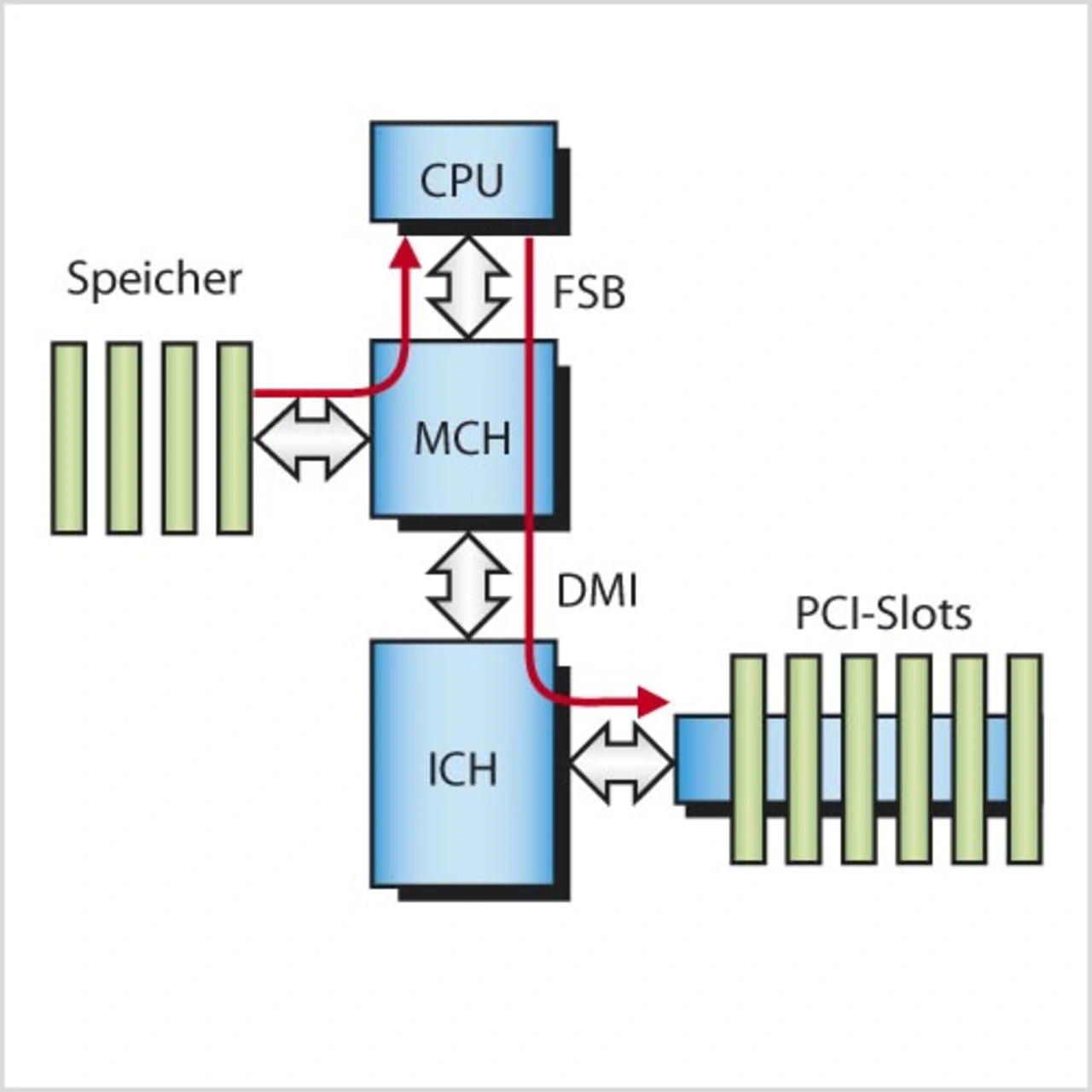 Während einer einzigen PCI-Übertragung von 4 byte, die z.B. drei PCI-Buszyklen lang dauert, arbeitet eine heutige 2-GHz-CPU nahezu 180 Befehle ab. Über einen 800 MHz schnellen FSB lassen sich in dieser Zeit bis zu 580 byte übertragen, über eine Dual-Channel-Speicherschnittstelle mit 667 MHz sind es 970 byte, und über ein Direct Media Interface immerhin noch 180 byte (siehe Tabelle).